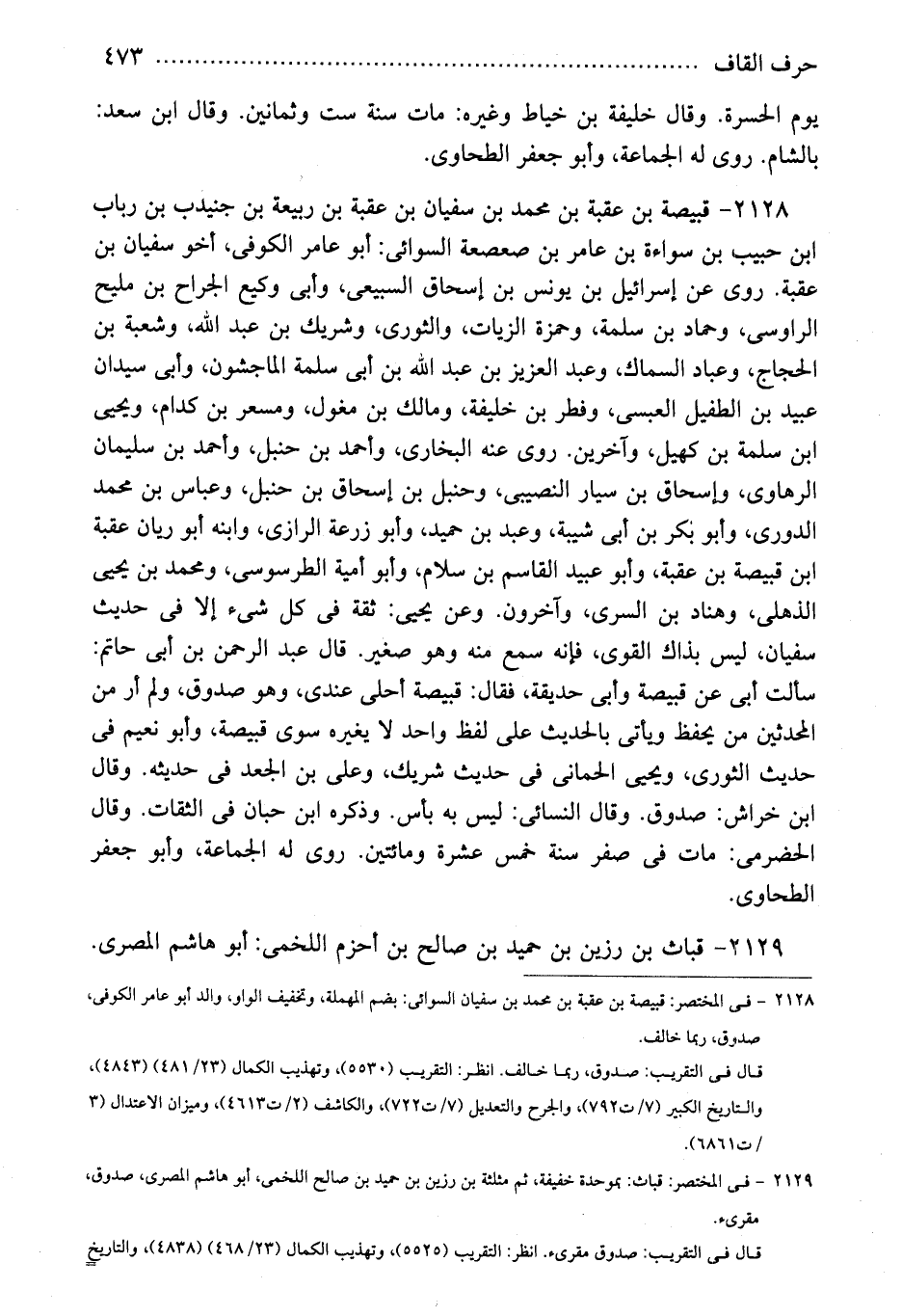 2128 - فى المختصر: قبيصة بن عقبة بن محمد بن سفيان السوائى: بضم المهملة، وتخفيف الواو، والد أبو عامر الكوفى، صدوق، ربما خالف.