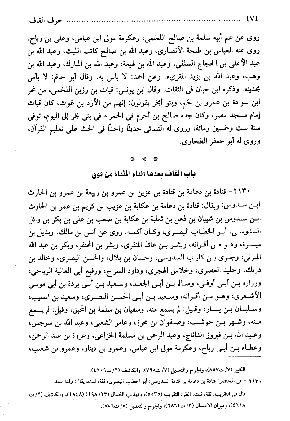 2130 - فى المختصر: قتادة بن دعامة بن قتادة السدوسى: أبو الخطاب البصرى، ثقة، ثبت، يقال: ولدا عمه.