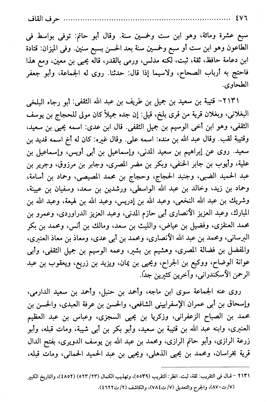 2131 - قتيبة بن سعيد بن جميل بن طريف بن عبد الله الثقفى: أبو رجاء البلخى البغلانى، وبغلان قرية من قرى بلخ، قيل: إن جده جميلاً كان مولى للحجاج بن يوسف الثقفى، وهو ابن أخى الوسيم بن جميل الثقفى. قال ابن عدى: اسمه يحيى بن سعيد، وقتيبة لقب. وقال عبد الله بن منده: اسمه على. وقال غيره: كان له أخ اسمه قديد بن سعيد. روى عن إبراهيم بن سعيد المدنى، وإسماعيل بن أبى أويس، وإسماعيل بن علية، وأيوب بن جابر الحنفى، وبكر بن مضر المصرى، وجابر بن مرزوق، وجرير بن عبد الحميد الضبى، وجنبد الحجاج، وحجاج بن محمد المصيصى، وحماد بن أسامة، وحماد بن زيد، وخالد بن عبد الله الواسطى، ورشدين بن سعد، وسفيان بن عيينة، وشريك بن عبد الله النخعى، وعبد الله بن إدريس، وعبد الله بن لهيعة، وعبد الله بن المبارك، وعبد العزيز الأنصارى أبى حازم المدنى، وعبد العزيز الدراوردى، وعمرو بن محمد العنقزى، وفضيل بن عياض، والليث بن سعد، ومالك بن أنس، ومحمد بن بكر البرسانى، ومحمد بن عبد الله الأنصارى، ومحمد بن أبى عدى، ومعاذ بن معاذ العنبرى، والمفضل بن فضالة المصرى، وهشيم بن بشير، وعمه الوسيم بن جميل الثقفى، وأبى عوانة الوضاح، ووكيع بن الجراح، ويحيى بن يمان، ويزيد بن زريع، ويعقوب بن عبد الرحمن الأسكندرانى، وآخرين كثيرين جدًا.