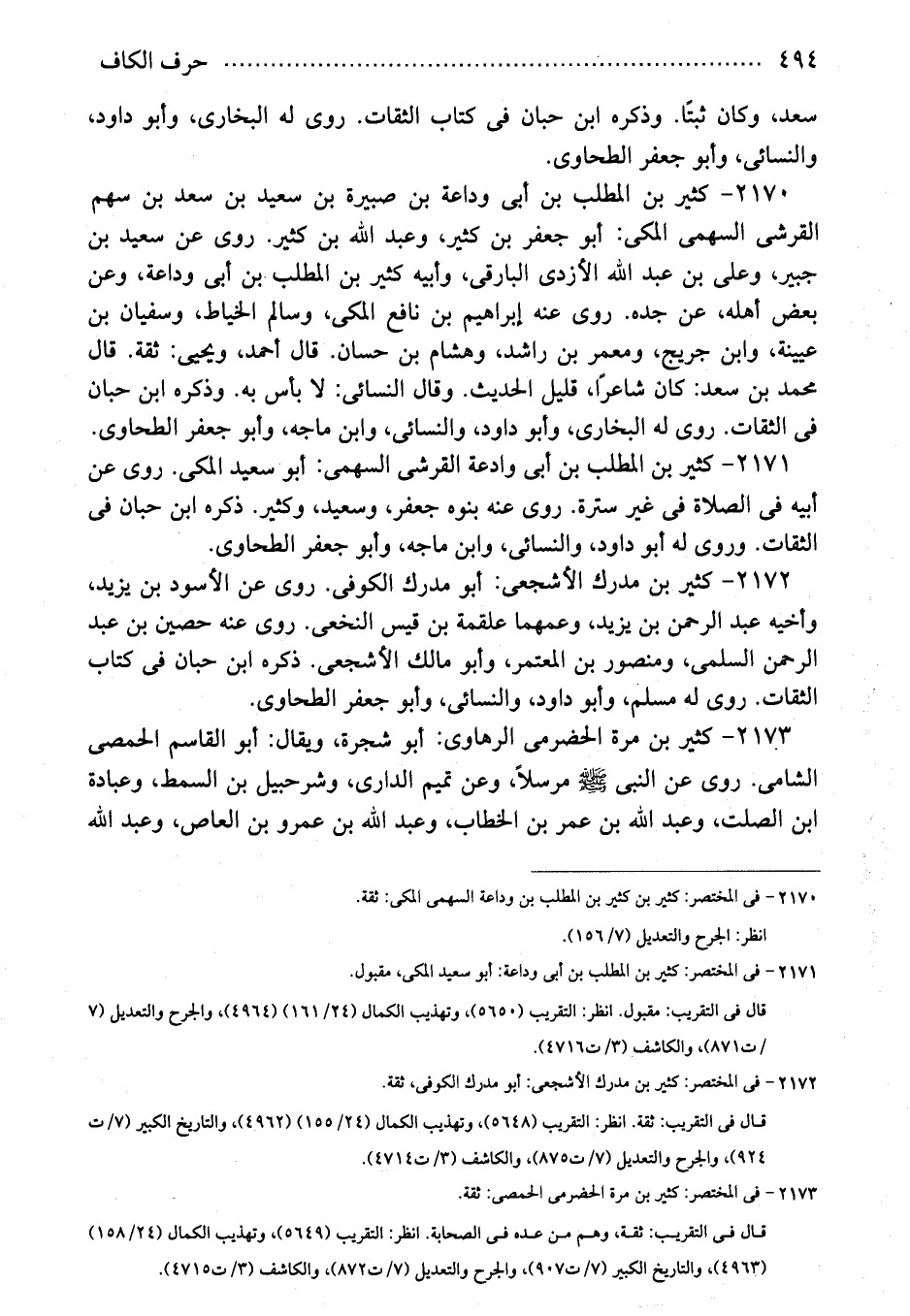 2173 - كثير بن مرة الحضرمى الرهاوى: أبو شجرة، ويقال: أبو القاسم الحمصى الشامى. روى عن النبى - صلى الله عليه وسلم - مرسلاً، وعن تميم الدارى، وشرحبيل بن السمط، وعبادة ابن الصلت، وعبد الله بن عمر بن الخطاب، وعبد الله بن عمرو بن العاص، وعبد الله