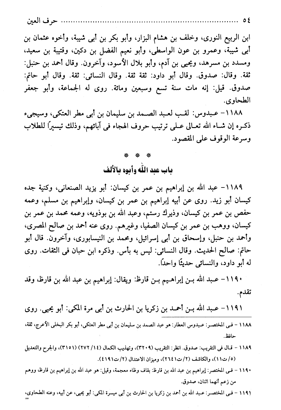 1188 - عبدوس: لقب لعبد الصمد بن سليمان بن أبى مطر العتكى، وسيجىء ذكره إن شاء الله تعالى على ترتيب حروف الهجاء فى آبائهم، وذلك تيسيرًا للطلاب وسرعة الوقوف على المقصود.