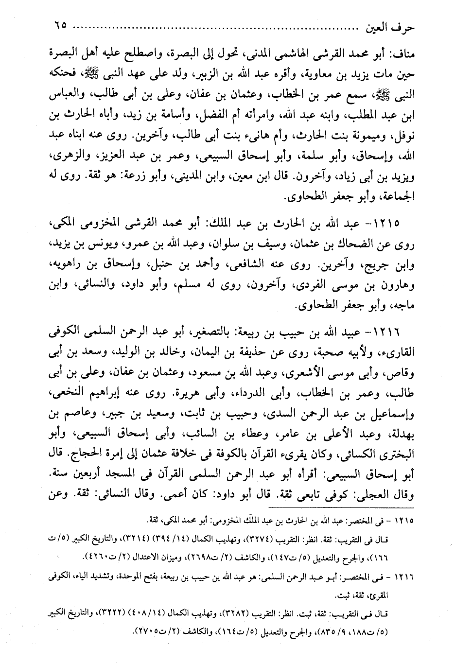 1215 - عبد الله بن الحارث بن عبد الملك: أبو محمد القرشى المخزومى المكى، روى عن الضحاك بن عثمان، وسيف بن سلوان، وعبد الله بن عمرو، ويونس بن يزيد، وابن جريج، وآخرين. روى عنه الشافعى، وأحمد بن حنبل، وإسحاق بن راهويه، وهارون بن موسى الفردى، وآخرون، روى له مسلم، وأبو داود، والنسائى، وابن ماجه، وأبو جعفر الطحاوى.