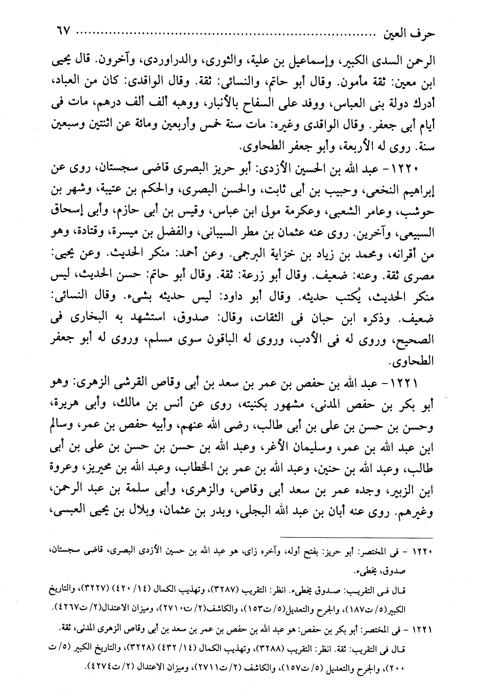 1220 - عبد الله بن الحسين الأزدى: أبو حريز البصرى قاضى سجستان، روى عن إبراهيم النخعى، وحبيب بن أبى ثابت، والحسن البصرى، والحكم بن عتيبة، وشهر بن حوشب، وعامر الشعبى، وعكرمة مولى ابن عباس، وقيس بن أبى حازم، وأبى إسحاق السبيعى، وآخرين. روى عنه عثمان بن مطر السيبانى، والفضل بن ميسرة، وقتادة، وهو من أقرانه، ومحمد بن زياد بن خزاية البرجمى. وعن أحمد: منكر الحديث. وعن يحيى: مصرى ثقة. وعنه: ضعيف. وقال أبو زرعة: ثقة. وقال أبو حاتم: حسن الحديث، ليس منكر الحديث، يُكتب حديثه. وقال أبو داود: ليس حديثه بشىء. وقال النسائى: ضعيف. وذكره ابن حبان فى الثقات، وقال: صدوق، استشهد به البخارى فى الصحيح، وروى له فى الأدب، وروى له الباقون سوى مسلم، وروى له أبو جعفر الطحاوى.