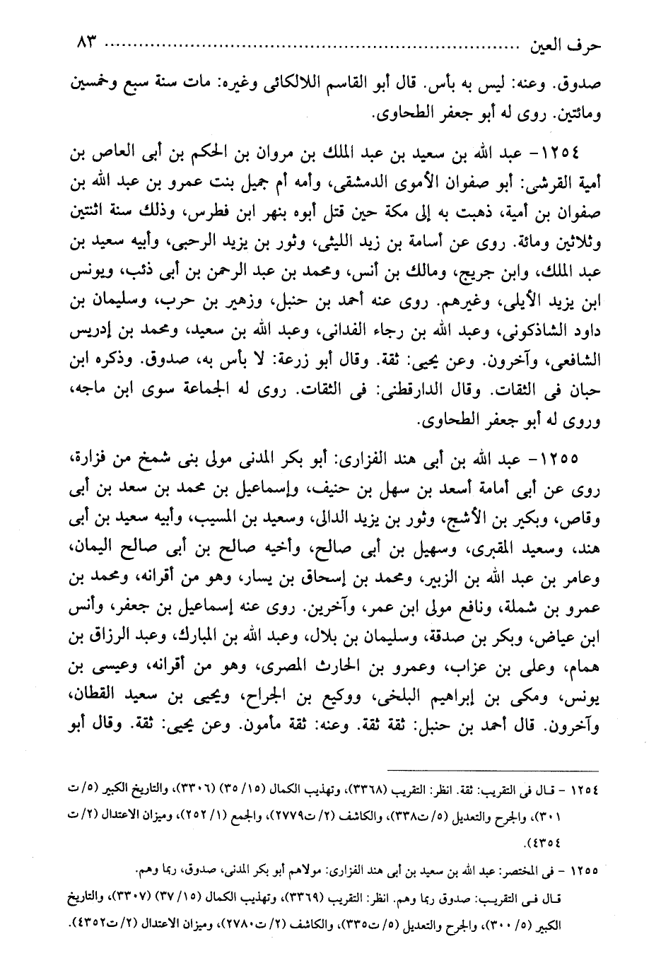 1254 - عبد الله بن سعيد بن عبد الملك بن مروان بن الحكم بن أبى العاص بن أمية القرشى: أبو صفوان الأموى الدمشقى، وأمه أم جميل بنت عمرو بن عبد الله بن صفوان بن أمية، ذهبت به إلى مكة حين قتل أبوه بنهر ابن فطرس، وذلك سنة اثنتين وثلاثين ومائة. روى عن أسامة بن زيد الليثى، وثور بن يزيد الرحبى، وأبيه سعيد بن عبد الملك، وابن جريج، ومالك بن أنس، ومحمد بن عبد الرحمن بن أبى ذئب، ويونس ابن يزيد الأيلى، وغيرهم. روى عنه أحمد بن حنبل، وزهير بن حرب، وسليمان بن داود الشاذكونى، وعبد الله بن رجاء الفدانى، وعبد الله بن سعيد، ومحمد بن إدريس الشافعى، وآخرون. وعن يحيى: ثقة. وقال أبو زرعة: لا بأس به، صدوق. وذكره ابن حبان فى الثقات. وقال الدارقطنى: فى الثقات. روى له الجماعة سوى ابن ماجه، وروى له أبو جعفر الطحاوى.