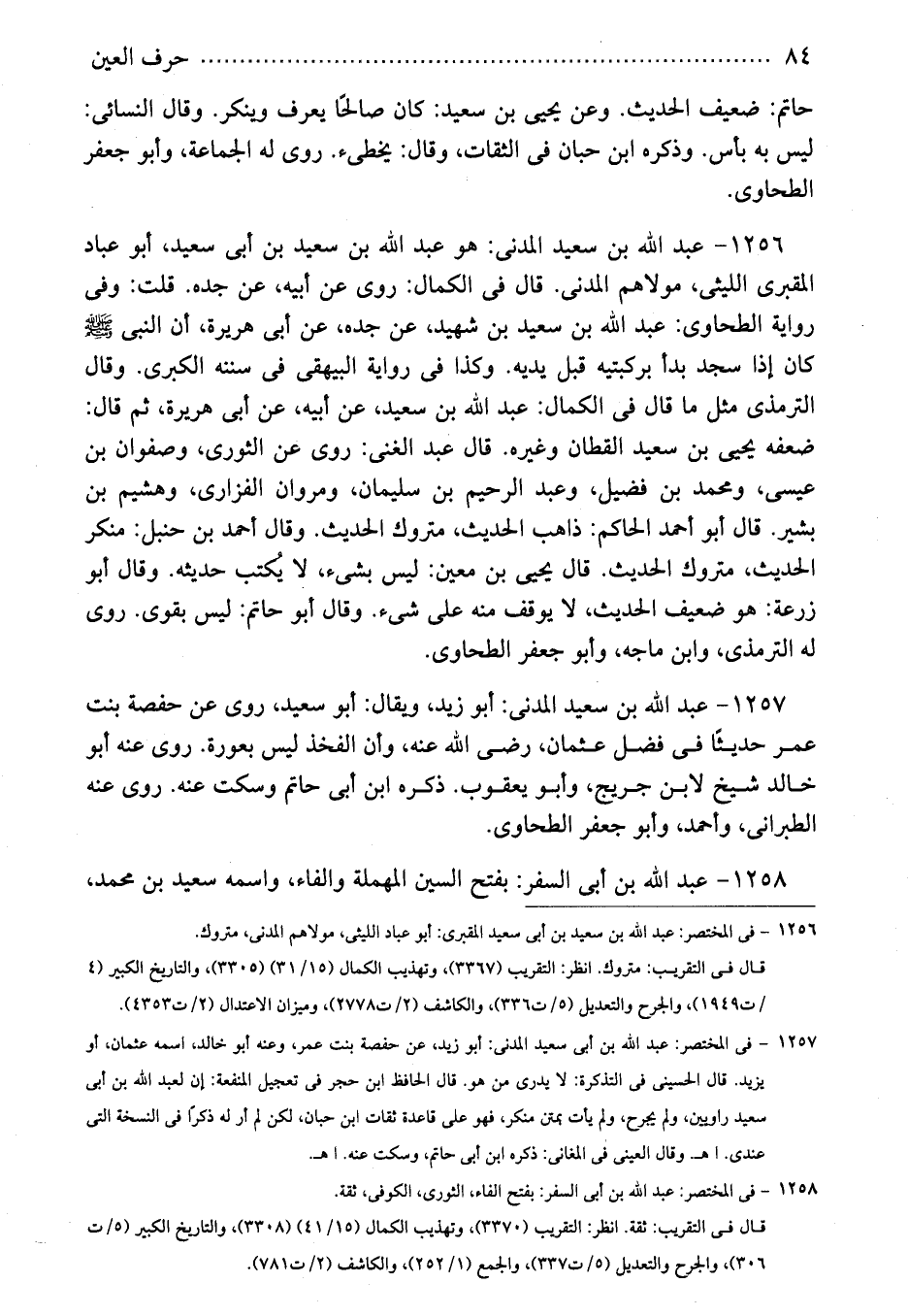 1256 - فى المختصر: عبد الله بن سعيد بن أبى سعيد المقبرى: أبو عباد الليثى، مولاهم المدنى، متروك. =