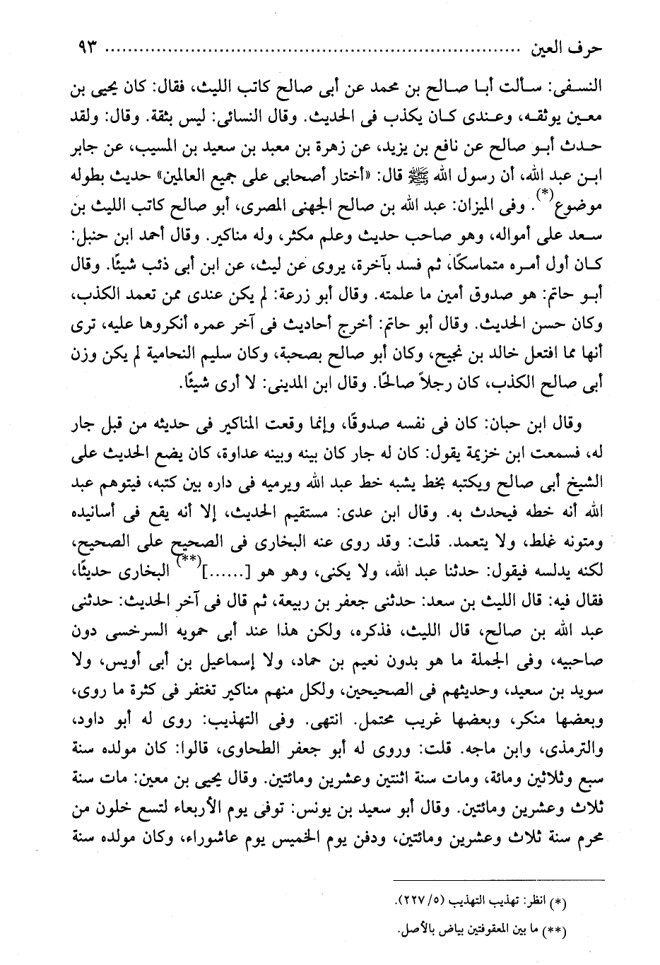 النسفى: سألت أبا صالح بن محمد عن أبى صالح كاتب الليث، فقال: كان يحيى بن معين يوثقه، وعندى كان يكذب فى الحديث. وقال النسائى: ليس بثقة. وقال: ولقد حدث أبو صالح عن نافع بن يزيد، عن زهرة بن معبد بن سعيد بن المسيب، عن جابر ابن عبد الله، أن رسول الله - صلى الله عليه وسلم - قال: "أختار أصحابى على جميع العالمين" حديث بطوله موضوع (*) . وفى الميزان: عبد الله بن صالح الجهنى المصرى، أبو صالح كاتب الليث بن سعد على أمواله، وهو صاحب حديث وعلم مكثر، وله مناكير. وقال أحمد ابن حنبل: كان أول أمره متماسكًا، ثم فسد بآخرة، يروى عن ليث، عن ابن أبى ذئب شيئًا. وقال أبو حاتم: هو صدوق أمين ما علمته. وقال أبو زرعة: لم يكن عندى ممن تعمد الكذب، وكان حسن الحديث. وقال أبو حاتم: أخرج أحاديث فى آخر عمره أنكروها عليه، ترى أنها مما افتعل خالد بن نجيح، وكان أبو صالح بصحبة، وكان سليم النحامية لم يكن وزن أبى صالح الكذب، كان رجلاً صالحًا. وقال ابن المدينى: لا أرى شيئًا.