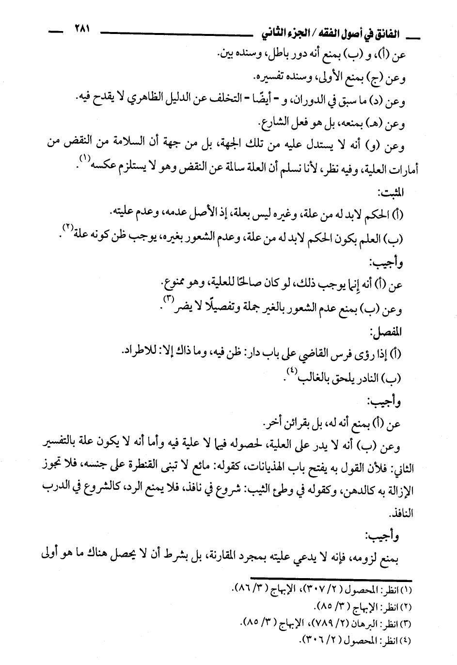 وعن (ب) أنه لا يدر على العلية، لحصوله فيما لا علية فيه وأما أنه لا يكون علة بالتفسير الثاني: فلأن القول به يفتح باب الهذيانات، كقوله: مائع لا تبنى القنطرة على جنسه، فلا تجوز الإزالة به كالدهن، وكقوله في وطئ الثيب: شروع في نافذ، فلا يمنع الرد، كالشروع في الدرب النافذ.