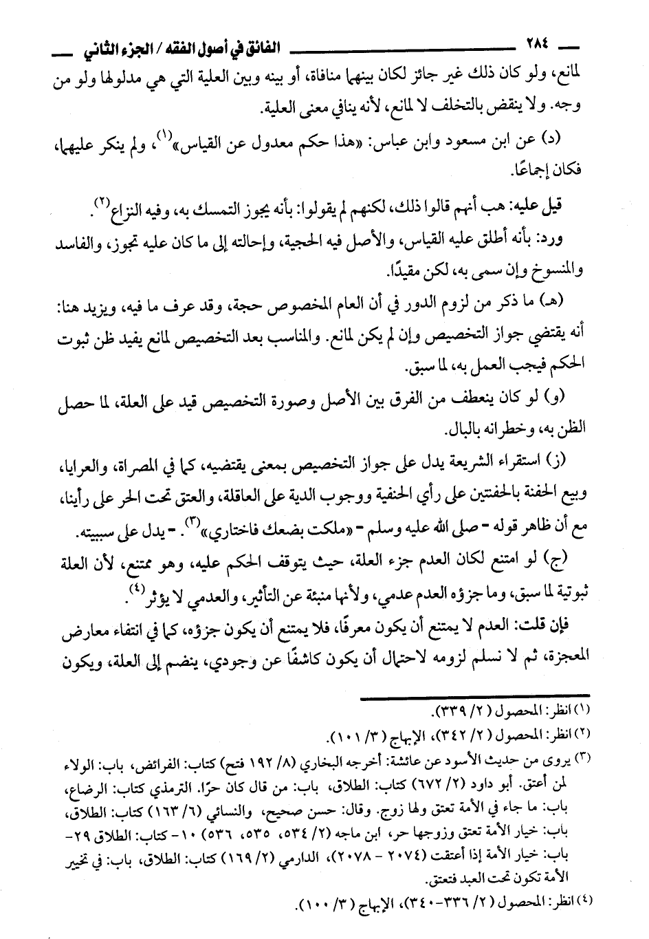 (ز) استقراء الشريعة يدل على جواز التخصيص بمعنى يقتضيه، كما في المصراة، والعرايا، وبيع الحفنة بالحفنتين على رأي الحنفية ووجوب الدية على العاقلة، والعتق تحت الحر على رأينا، مع أن ظاهر قوله - صلى الله عليه وسلم - "ملكت بضعك فاختاري". - يدل على سببيته.