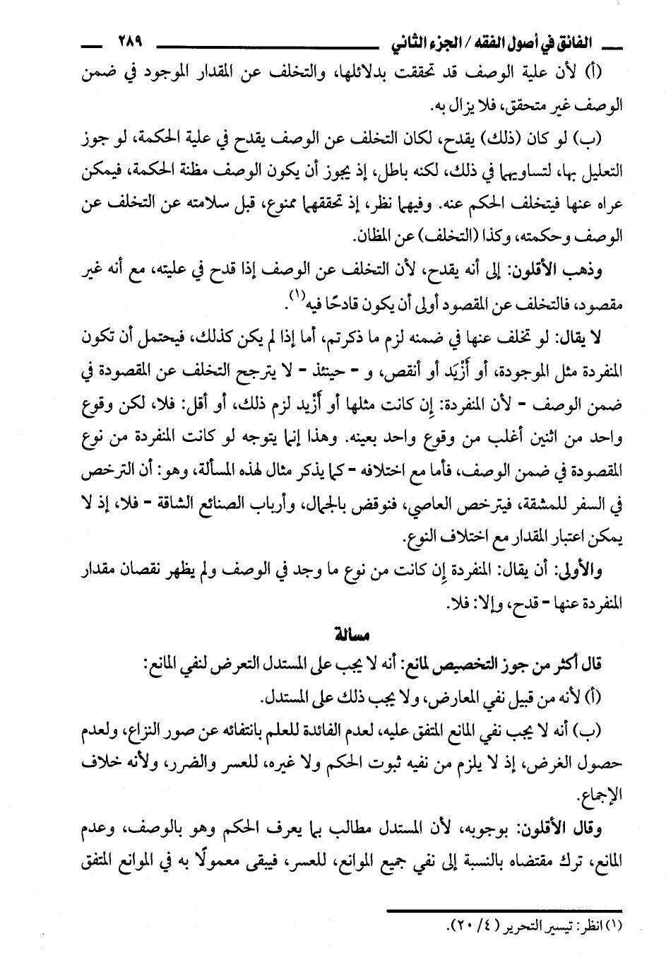 لا يقال: لو تخلف عنها في ضمنه لزم ما ذكرتم، أما إذا لم يكن كذلك، فيحتمل أن تكون المنفردة مثل الموجودة، أو أزيد أو أنقص، و - حينئذ - لا يترجح التخلف عن المقصودة في ضمن الوصف - لأن المنفردة: إن كانت مثلها أو أزيد لزم ذلك، أو أقل: فلا، لكن وقوع واحد من اثنين أغلب من وقوع واحد بعينه. وهذا إنما يتوجه لو كانت المنفردة من نوع المقصودة في ضمن الوصف، فأما مع اختلافه - كما يذكر مثال لهذه المسألة، وهو: أن الترخصفي السفر للمشقة، فيترخص العاصي، فنوقض بالجمال، وأرباب الصنائع الشاقة - فلا، إذ لا يمكن اعتبار المقدار مع اختلاف النوع.
