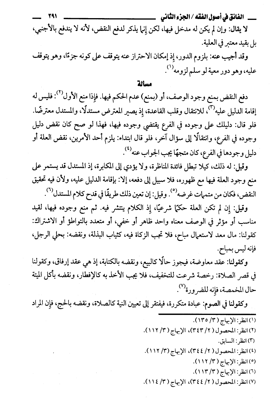 دفع النقض بمنع وجود الوصف، أو (بمنع) عدم الحكم فيها. فإذا منع الأول: فليس له إقامة الدليل عليه، للانتقال وقلب القاعدة، إذ يصير المعترض مستدلا، والمستدل معترضا. فلو قال: دليلك على وجوده في الفرع يقتضي وجوده فيها، فهذا لو صح كان نقض دليل وجوده في الفرع، وانتقالا إلى سؤال آخر، فلو قال ابتداء: يلزم أحد الأمرين، نقض العلة أو دليل وجودها في الفرع، كان متجها يجب الجواب عنه.