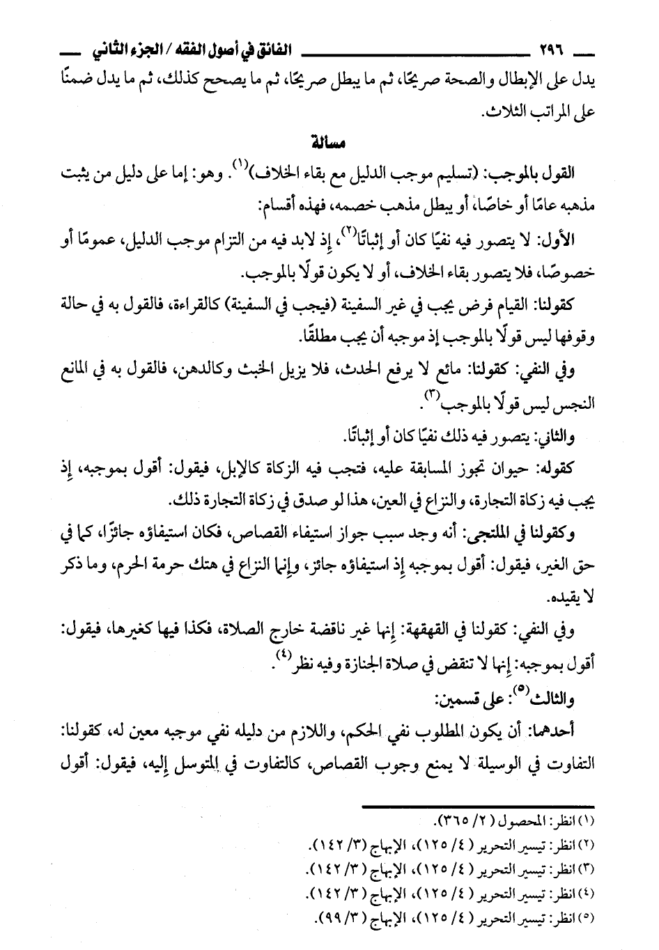 القول بالموجب: (تسليم موجب الدليل مع بقاء الخلاف). وهو: غما على دليل من يثبت مذهبه عاما أو خاصا، أو يبطل مذهب خصمه، فهذه أقسام: