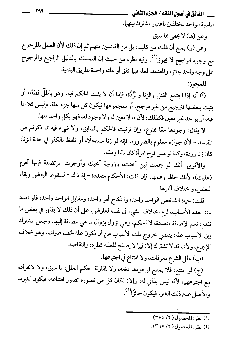 (أ) أنه إذا اجتمع القتل والزنا والردة، فإما أن لا يثبت الحكم فيه، وهو باطل قطعا، أو يثبت ببعضها فترجيح من غير مرجح، أو بمجموعها فيكون كل منها جزء علة، وليس كلامنا فيه، أو بواحد غير معين فكذلك، لأن ما لا تعين له ولا وجود له، فهو بكل واحد منها.