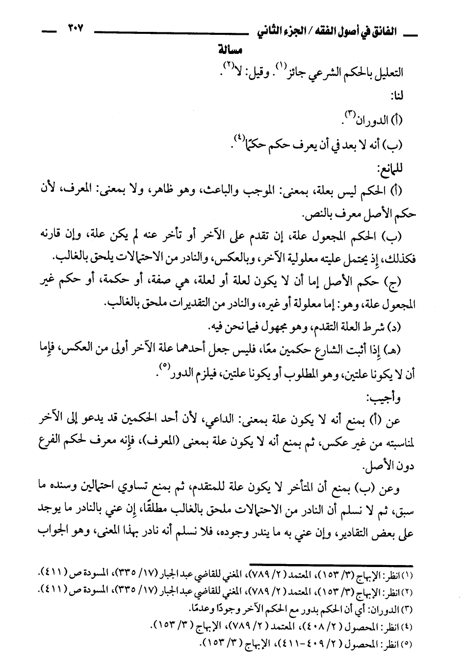 (هـ) إذا أثبت الشارع حكمين معا، فليس جعل أحدهما علة الآخر أولى من العكس، فإما أن لا يكونا علتين، وهو المطلوب أو يكونا علتين، فيلزم الدور.