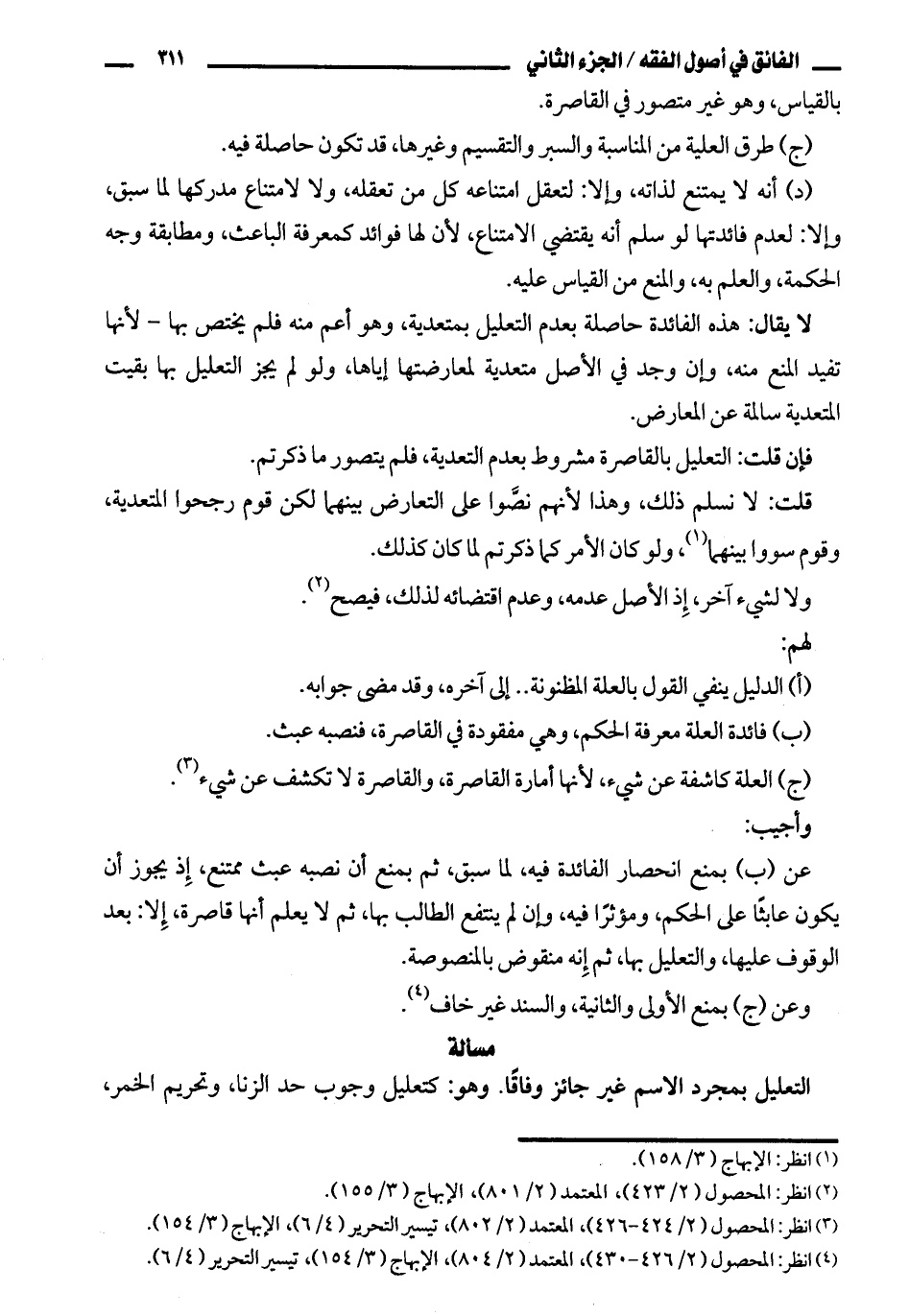 (د) أنه لا يمتنع لذاته، وإلا: لتعقل امتناعه كل من تعقله، ولا لامتناع مدركها لما سبق، وإلا: لعدم فائدتها لو سلم أنه يقتض الامتناع، لأن لها فوائد كمعرفة الباعث، ومطابقة وجه الحكمة، والعلم به، والمنع من القياس عليه.