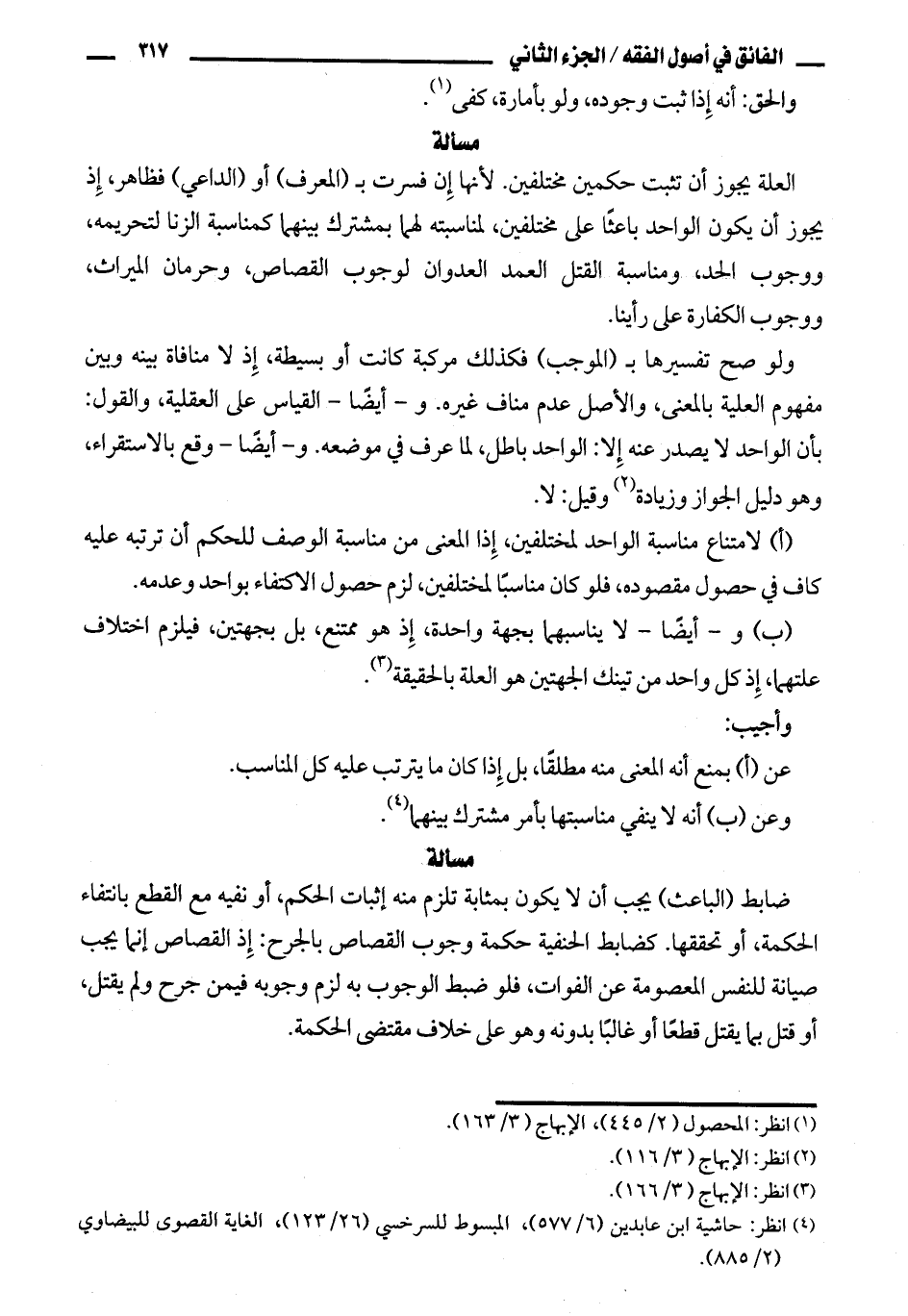 ضابط (الباعث) يجب أن لا يكون بمثابة تلزم منه إثبات الحكم، أو نفيه مع القطع بانتفاء الحكمة، أو تحققها. كضابط الحنفية حكمة وجوب القصاص بالجرح: إذ القصاص إنما يجب صيانة للنفس المعصومة عن الفوات، فلو ضبط الوجوب به لزم وجوبه فيمن جرح ولم يقتل، أو قتل بما يقتل قطعا أو غالبا بدونه وهو على خلاف مقتضى الحكمة.