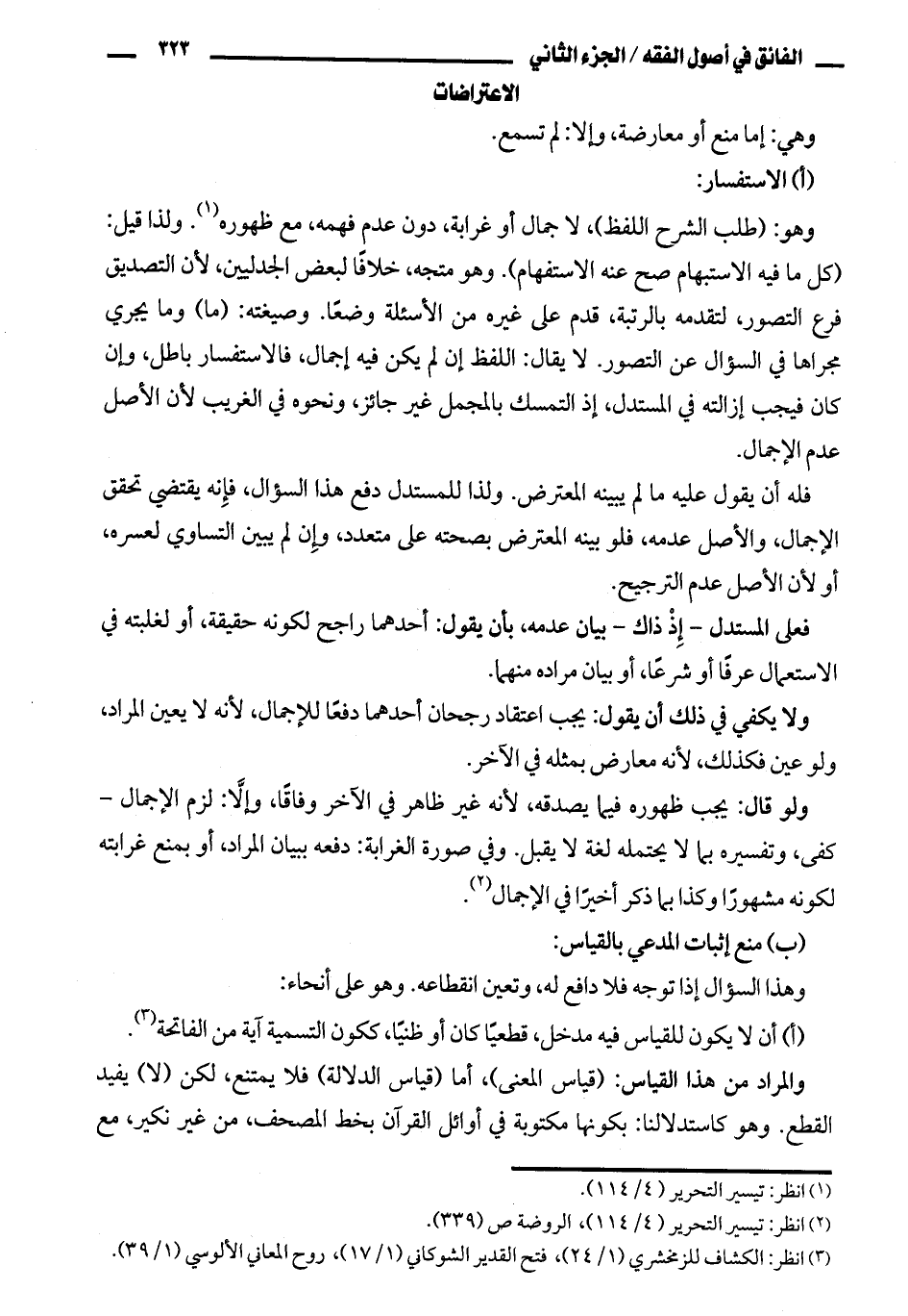 وهو: (طلب الشرح اللفظ)، لا جمال أو غرابة، دون عدم فهمه، مع ظهوره. ولذا قيل: (كل ما فيه الاستبهام صح عنه الاستفهام). وهو متجه، خلافا لبعض الجدليين، لأن التصديق فرع التصور، لتقدمه بالرتبة، قدم على غيره من الأسئلة وضعا. وصيغة: (ما) وما يجري مجراها في السؤال عن التصور. لا يقال: اللفظ غ، لم يكن فيه إجمال، فالاستفسار باطل، وإن كان فيجب إزالته في المستدل، إذ التمسك بالمجمل غير جائز، ونحوه في الغريب لأن الأصل عدم الإجمال.