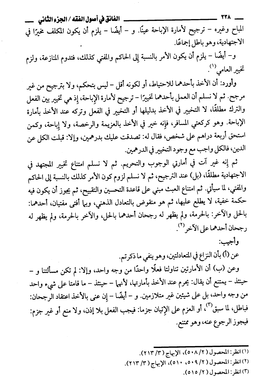 وأورد: أن الأخذ بأحدهما للاحتياط، أو لكونه أقل - ليس بتحكم، ولا بترجيح من غير مرجح. ثم لا نسلم أن العمل بأحدهما تخييرا - ترجيح لأمارة الإباحة، إذ هي تخيير بين الفعل والترك مطلقا، لا التخيير في الأخذ بدليلها أو التخيير في الفعل وتركه عند الأخذ بأمارة الإباحة. وهو كركعتي المسافر، فإنه خير في الأخذ بالعزيمة والرخصة، ولا إباحة، وكمن استحق أربعة دراهم على شخص، فقال له: تصدقت عليك بدرهمين، وإلا: قبلت الكل عن الدين، فالكل واجب مع وجود التخيير في الدرهمين.
