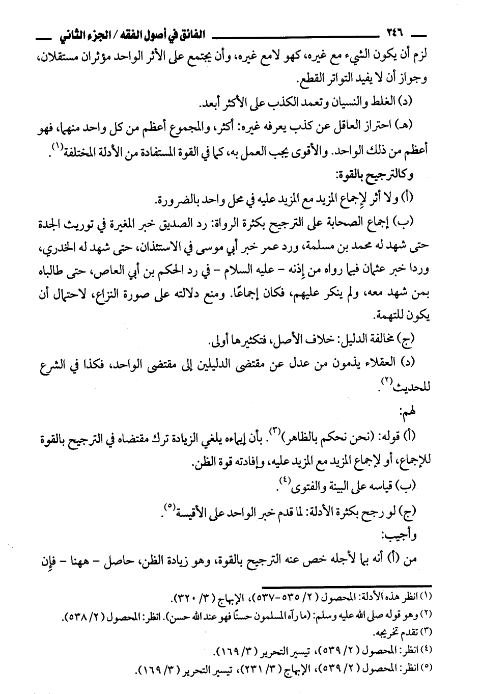 (ب) إجماع الصحابة على الترجيح بكثرة الرواة: رد الصديق خبر المغيرة في توريث الجدة حتى شهد له محمد بن مسلمة، ورد مر خبر أبي موسى في الاستئذان، حتى شهد له الخدري، وردا خبر عثمان فيما رواه من إذنه - عليه السلام - في رد الحكم بن أبي العصا، حتى طالباه بمن شهد معه، ولم ينكر عليهم، فكان إجماعا. ومنع دلالته على صورة النزاع، لاحتمال أن يكون للتهمة.