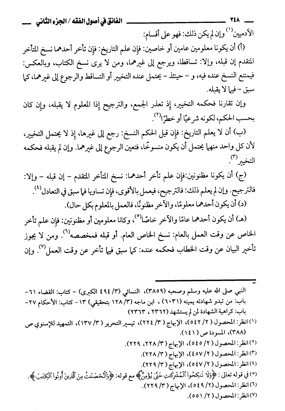 (ب) أن لا يعلم التاريخ: فإن قيل الحكم النسخ: رجع إلى غيرها، إذ لا يحتمل التخيير، لأن كل واحد منهما يحتمل أن يكون منسوخا، فتعين الرجوح إلى غيرهما. وإن لم يقبله فحكمه التخيير.