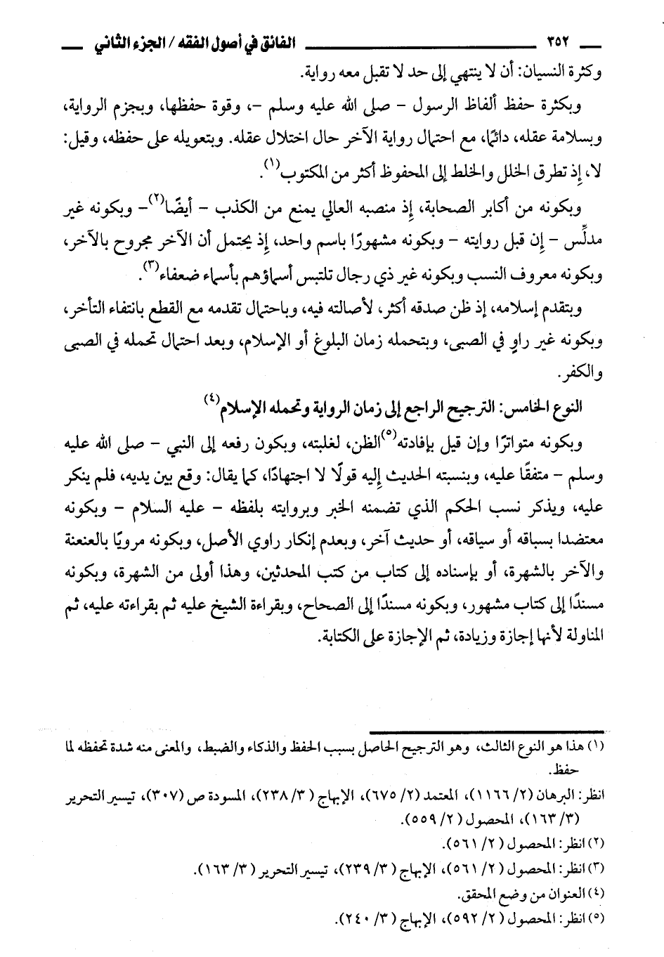 وبكثرة حفظ ألفاظ الرسول - صلى الله عليه وسلم -، وقوة حفظها، وبجزم الرواية، وبسلامة عقله، دائما، مع احتمال رواية الآخر حال اختلال عقله. وبتعويله على حفظه، وقيل: لا، إذ تطرق الخلل والخلط إلى المحفوظ أكثر من المكتوب.