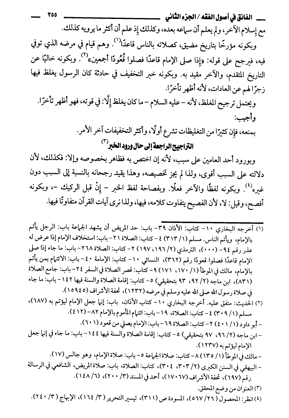 وبكونه مؤرخا بتاريخ مضيق كصلاته بالناس قاعد. وهم قيام في مرضه الذي توفي فيه، فيرجح على قوله: "إذا صلى الإمام قاعدا فصلوا قعودا أجمعين". وبكونه خاليا عن التاريخ المتقدم، والآخر مقيد به. وبكونه خبر التخفيف في حادثة كان الرسول يغلظ فيها زجرا لهم عن العادات، لأنه أظهر تأخرا.