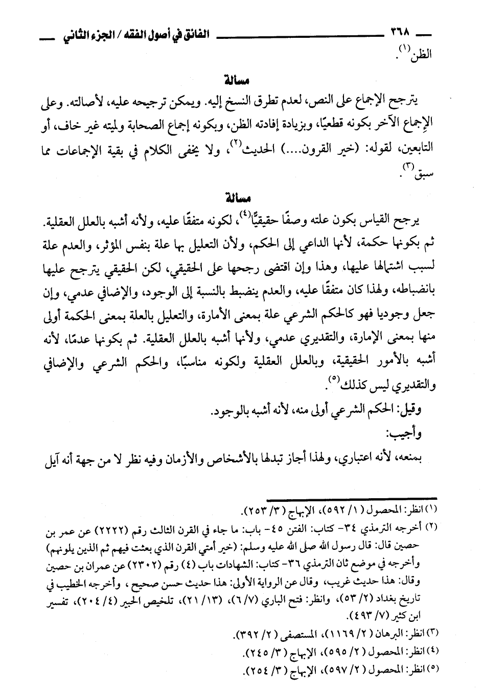ثم بكونها حكمة، لأنها الداعي إلى الحكم، ولأن التعليل بها علة بنفس المؤثر، والعدم علة لسبب اشتمالها عليها، وهذا وإن اقتضى رجحها على الحقيقي، لكن الحقيقي يترجح عليها بانضباطه، ولهذا كان متفقا عليه، والعدم ينضبط بالنسبة إلى الوجود، والإضافي عدمي، وإن جعل وجوديا فهو كالحكم الشرعي علة بمعنى الأمارة، والتعليل بالعلة بمعنى الحكمة أولى منها بمعنى الإمارة، والتقديري عدمي، ولأنها أشبه بالعلل العقلية. ثم بكونها عدما، لأنه أشبه بالأمور الحقيقية، وبالعلل العقلية ولكونه مناسبا، والحكم الشرعي والإضافي والتقديري ليس كذلك.