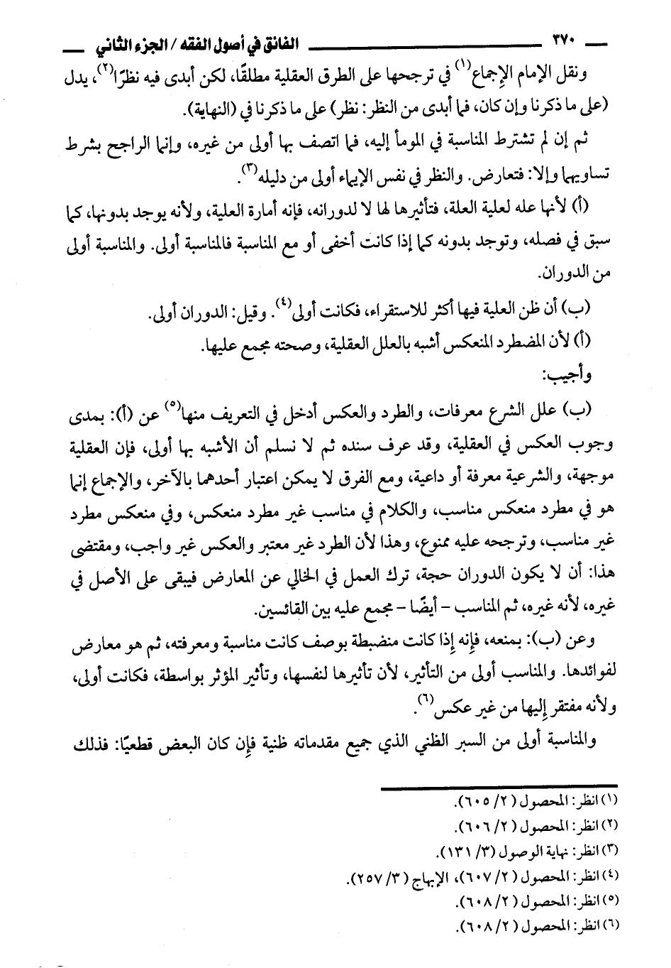 (ب) علل الشرع معرفات، والطرد والعكس أدخل في التعريف منها عن (أ): بمدى وجوب العكس في العقلية، وقد عرف سنده ثم لا نسلم أن الأشبه بها أولى، فإن العقلية موجهة، والشرعية معرفة أو داعية، ومع الفرق لا يمكن اعتبار أحدهما بالآخر، والإجماع إنما هو في مطرد منعكس مناسب، والكلام في مناسب غير مطرد منعكس، وفي منعكس مطرد غير مناسب، وترجحه عليه ممنوع، وهذا لأن الطرد غير معتبر والعكس غير واجب، ومقتضى هذا: أن لا يكون الدوران حجة، ترك العمل في الخالي عن المعارض فيبقى على الأصل في غيره، لأنه غيره، ثم المناسب - أيضا - مجمع عليه بين القائسين.