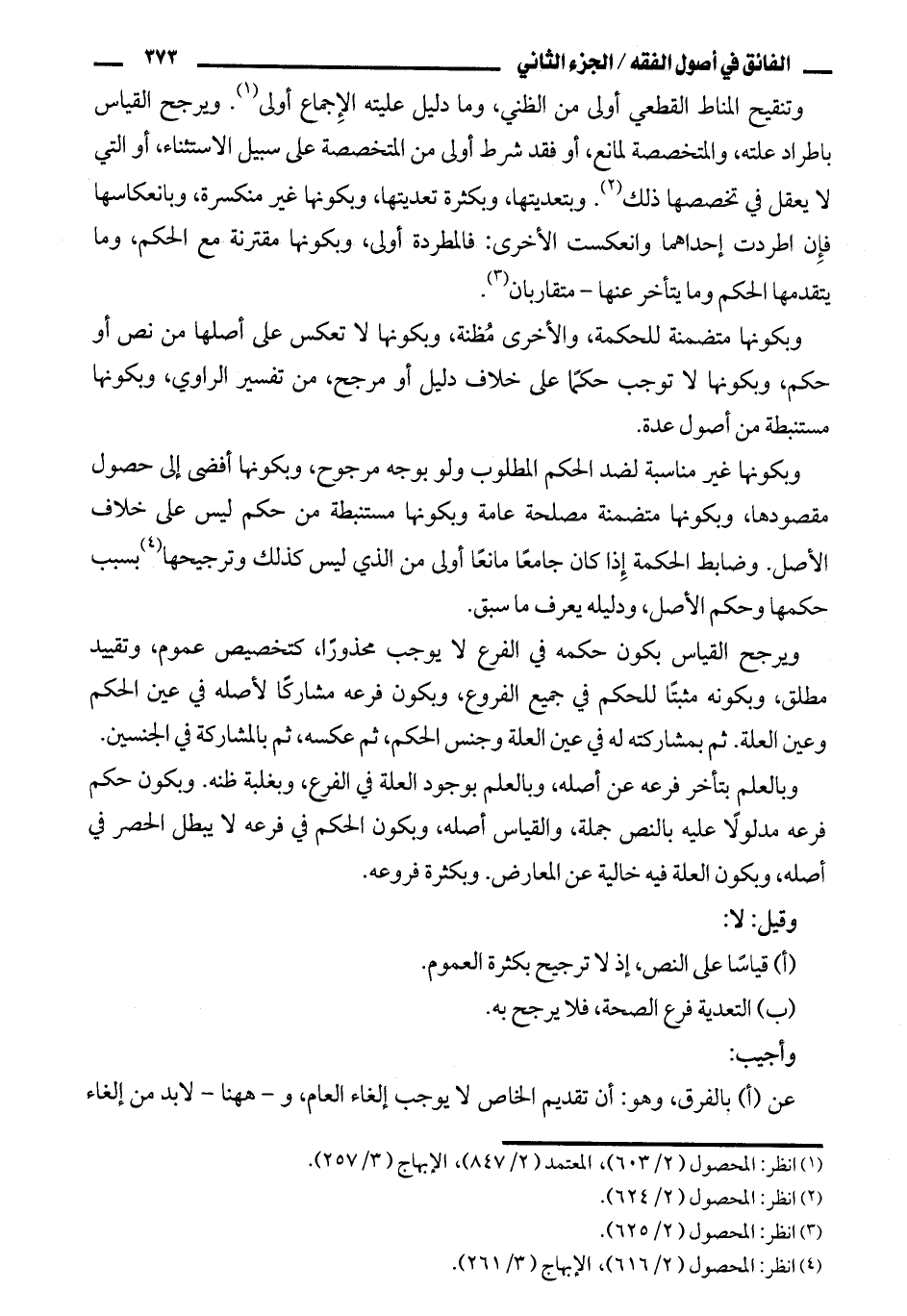 وتقيح المناط القطعي أولى من الظني، وما دليل عليته الإجماع أولى. ويرجح القياس باطراد علته، والمتخصصة لمانع، أو فقد شرط أولى من المتخصصة على سبيل الاستثناء، أو التي لا يعقل في تخصصها ذلك. وبتعديتها، وبكثر تعديتها، وبكونها غير منكسرة، وبانعكاسها فإن اطردت إحداهما وانعكست الأخرى: فالمطردة أولى، وبكونها مقترنة مع الحكم، وما يتقدمها الحكم وما يتأخر عنها - متقاربان.