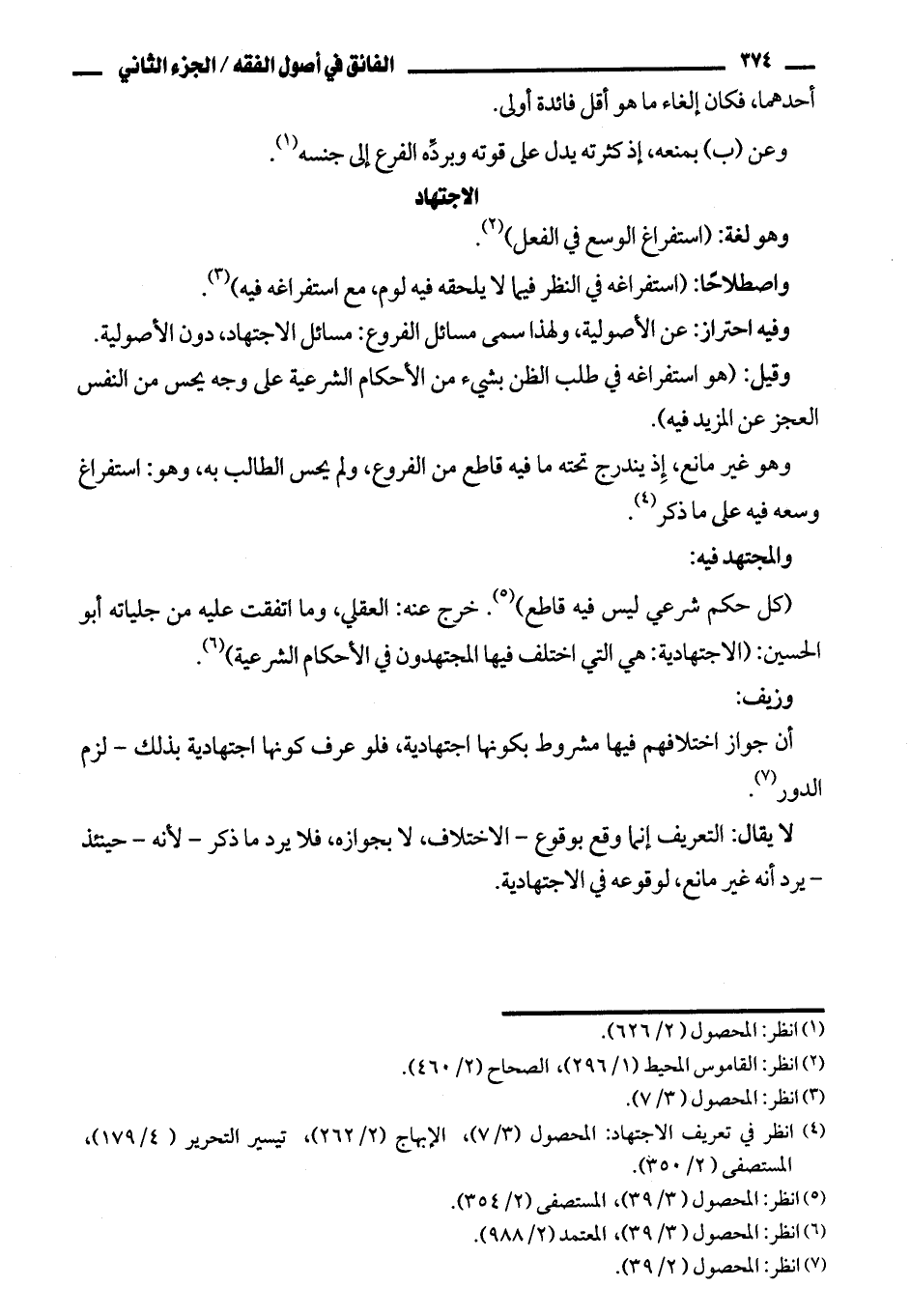 وقيل: (هو استفراغه في طلب الظن بشيء من الأحكام الشرعية على وجه يحس من النفس العجز عن المزيد فيه).