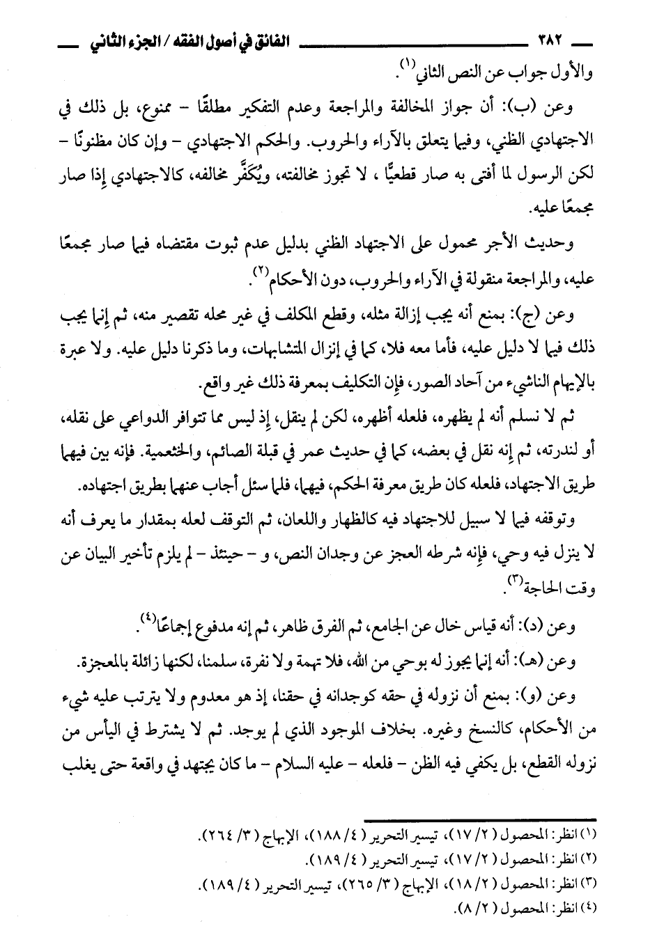 وعن (ب): أن جواز المخالفة والمراجعة وعدم التكفير مطلقا - ممنوع، بل ذلك في الاجتهادي الظني، وفيما يتعلق بالآراء والحروب. والحكم الاجتهادي - وإن كان مظنونا - لكن الرسول لما أفتى به صار قطعيا، لا تجوز مخالفته، ويكفر مخالفه، كالاجتهادي إذا صار مجمعا عليه.
