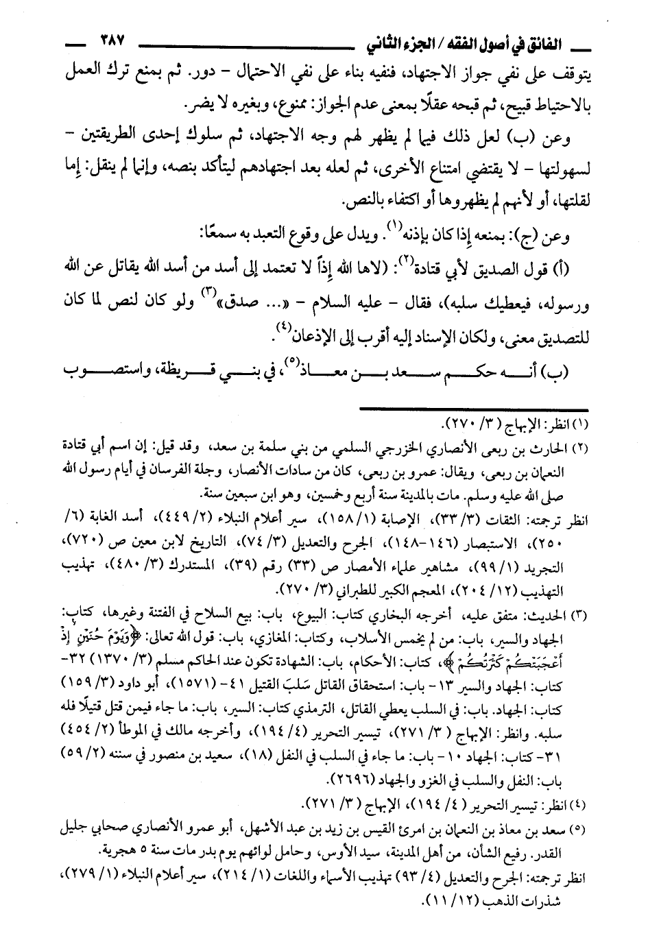(أ) قول الصديق لأبي قتادة: (لاها الله إذا لا تعتمد إلى أسد من أسد الله يقاتل عن الله ورسوله، فيعطيك سلبه)، فقال - عليه السلام - " ... صدق" ولو كان لنص لما كان للتصديق معنى، ولكان الإسناد إليه أقرب إلى الإذعان.