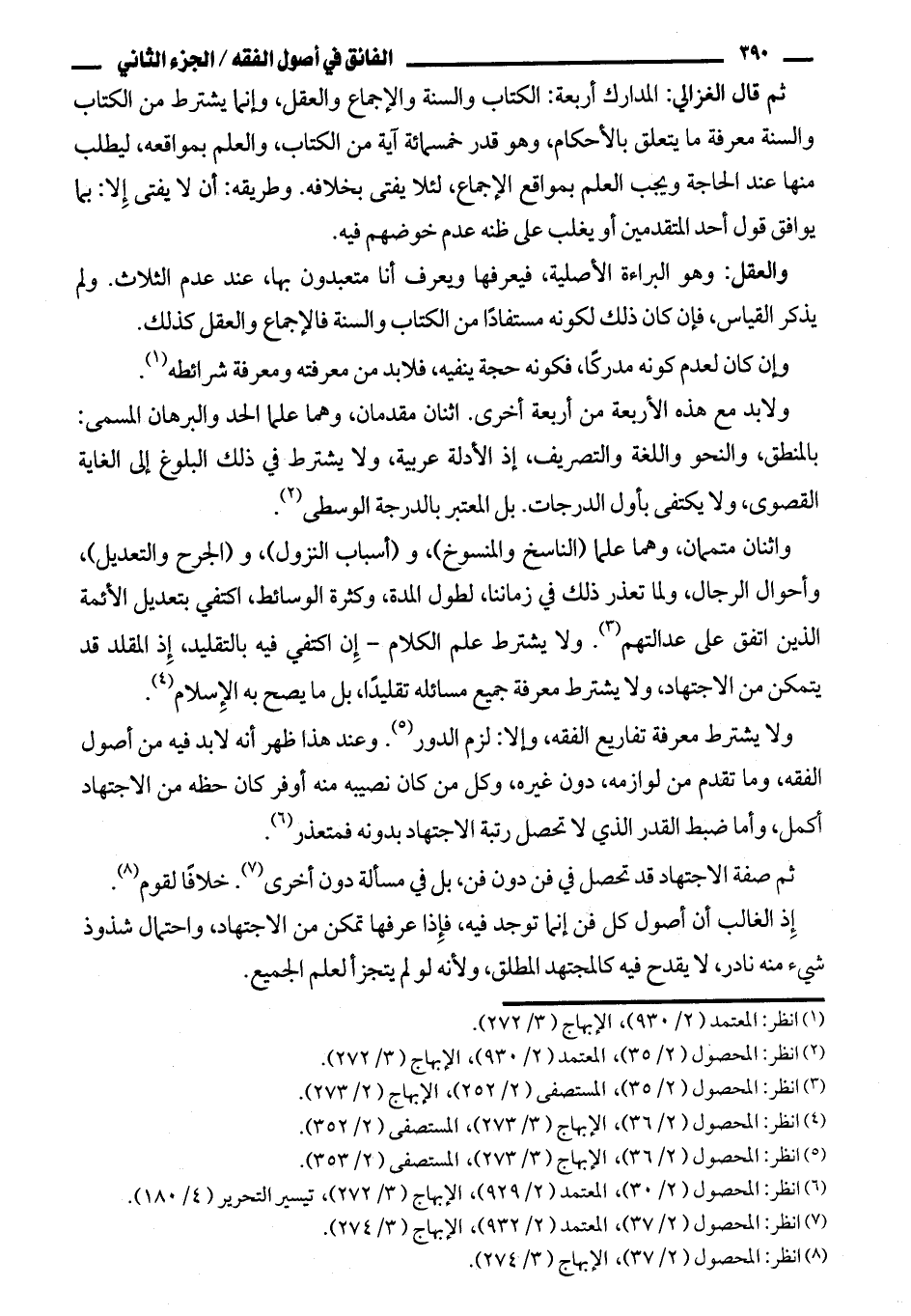ثم قال الغزالي: المدارك أربعة: الكتاب والسنة والجماع والعقل، وإنما يشترط من الكتاب والسنة معرفة ما يتعلق بالأحكام، وهو قدر خمسمائة آية من الكتاب، والعلم بمواقعه، ليطلب منها عند الحاجة ويجب العلم بمواقع الإجماع، لئلا يفتي بخلافه. وطريقة: أن لا يفتي إلا: بما يوافق قول أحد المتقدمين أو يغلب على نه عدم خوضهم فيه.