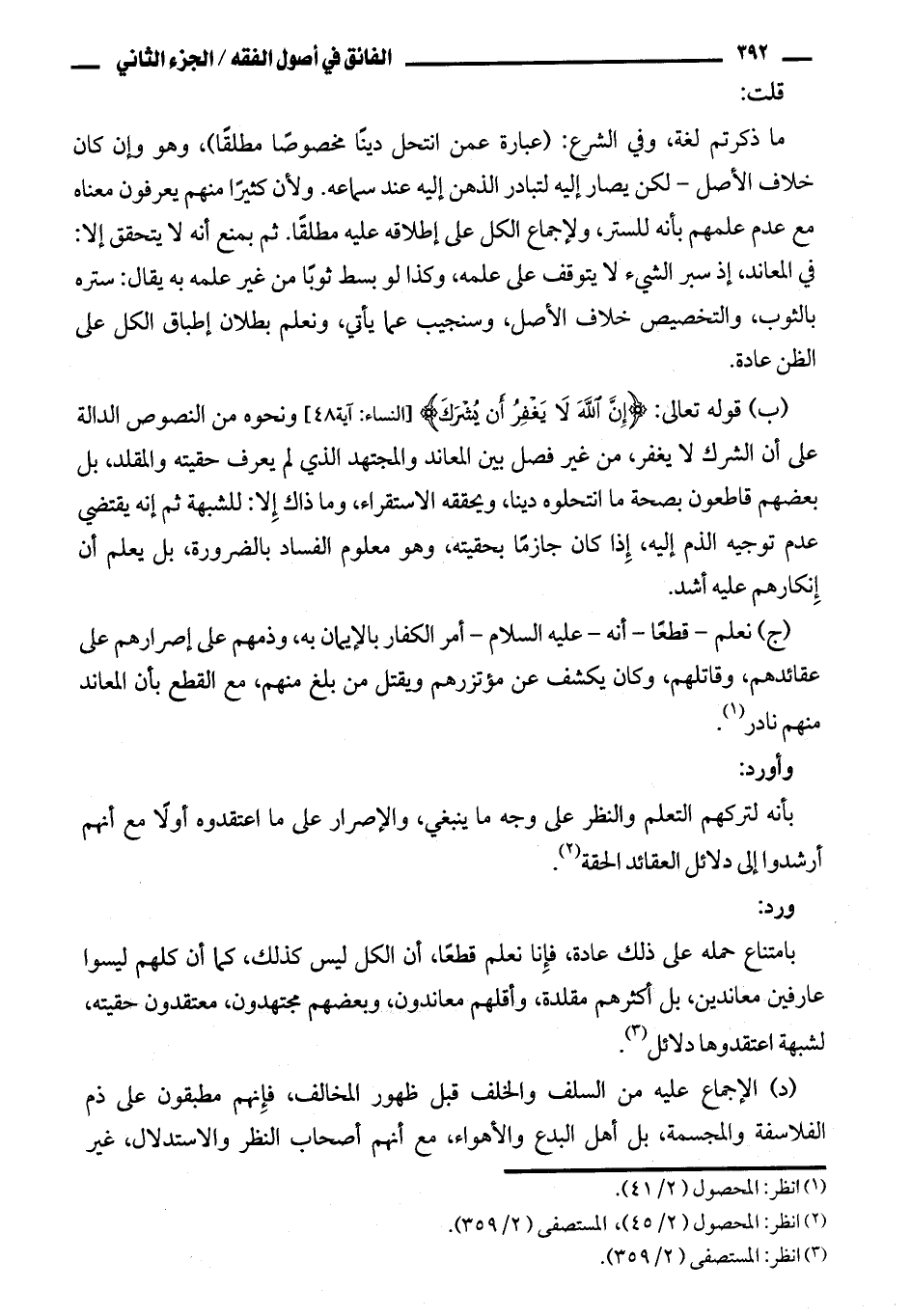 (ب) قوله تعالى: {إن الله لا يغفر أن يشرك} [النساء: آية ٤٨] ونحوه من النصوص الدالة على أن الشرك لا يغفر، من غير فصل بين المعاند والمجتهد الذي لم يعرف حقيته والمقلد، بل بعضهم قاطعون بصحة ما انتحلوه دينا، ويحققه الاستقراء، وما ذاك إلا: للشبهة ثم إنه يقتضي عدم توجيه الذم إليه، إذا كان جازما بحقيته، وهو معلوم الفساد بالضوررة، بل يعلم أن إنكارهم عليه أشد.