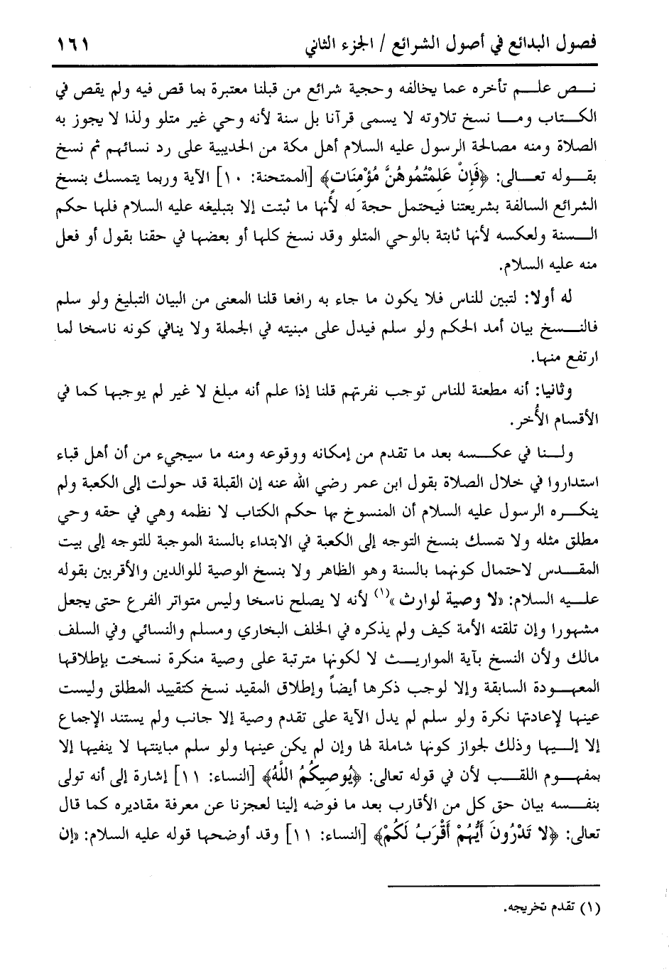 نص علم تأخره كما يخالفه وحجية شرائع من قبلنا معتبرة بما قص فيه ولم يقص في الكتاب وما نسخ تلاوته لا يسمى قرآنا بل سنة لأنه وحي غير متلو ولذا لا يجوز به الصلاة ومنه مصالحة الرسول عليه السلام أهل مكة من الحديبية على رد نسائهم ثم نسخ بقوله تعالى: {فَإِنْ عَلِمْتُمُوهُنَّ مُؤْمِنَاتٍ} [الممتحنة: 10] الآية وربما يتمسك بنسخ الشرائع السالفة بشريعتنا فيحتمل حجة له لأنها ما ثبتت إلا بتبليغه عليه السلام فلها حكم السنة ولعكسه لأنها ثابتة بالوحي المتلو وقد نسخ كلها أو بعضها في حقنا بقول أو فعل منه عليه السلام.