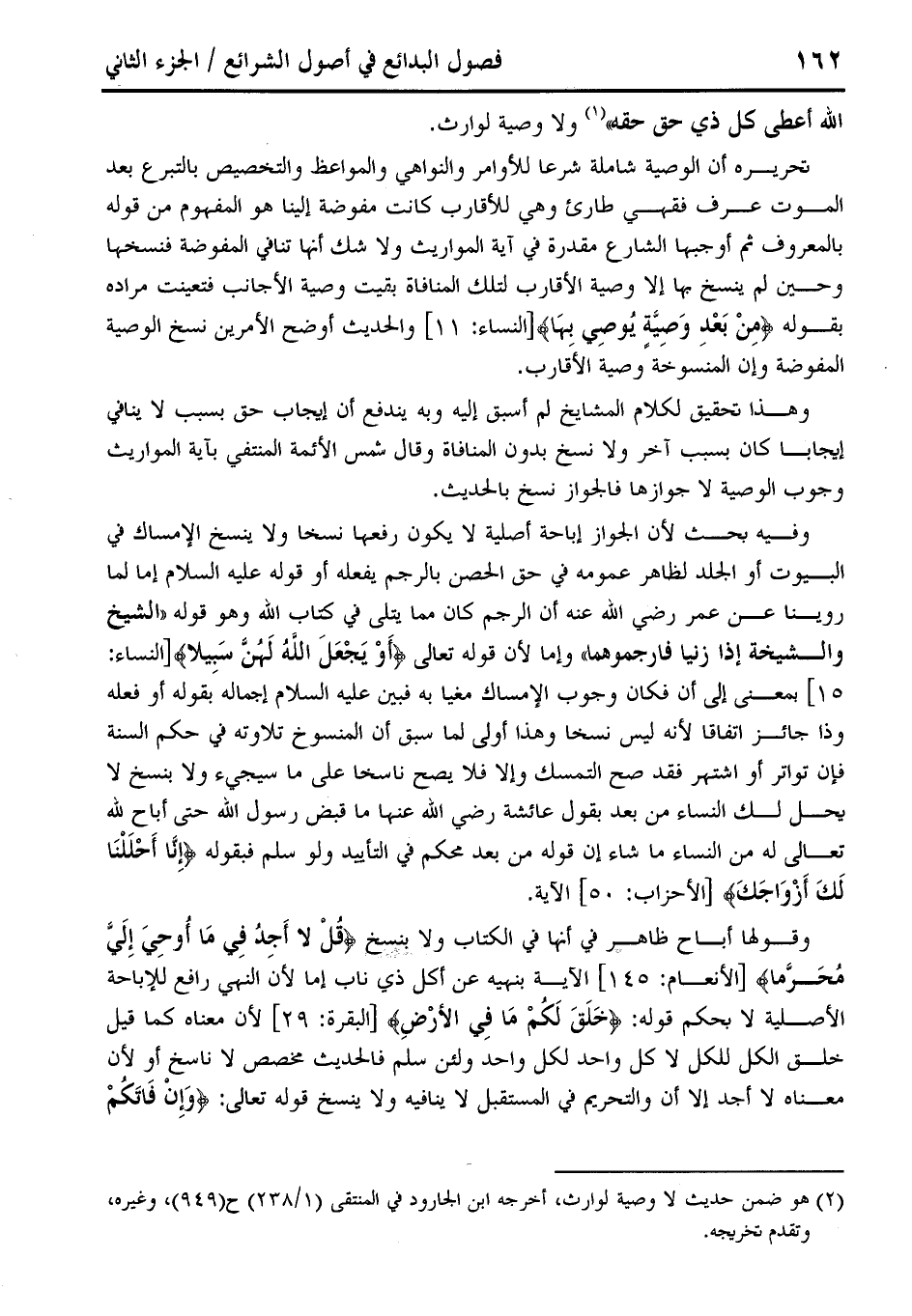 تحريره أن الوصية شاملة شرعا للأوامر والنواهي والمواعظ والتخصيص بالتبرع بعد الموت عرف فقهي طارئ وهي للأقارب كانت مفوضة إلينا هو المفهوم من قوله بالمعروف ثم أوجبها الشارع مقدرة في آية المواريث ولا شك أنها تنافي المفوضة فنسخها وحين لم ينسخ بها إلا وصية الأقارب لتلك المنافاة بقيت وصية الأجانب فتعينت مراده بقوله {بَعْدِ وَصِيَّةٍ يُوصِي بِهَا} [النساء: 11] والحديث أوضح الأمرين نسخ الوصية المفوضة وإن المنسَوخة وصية الأَقارب.