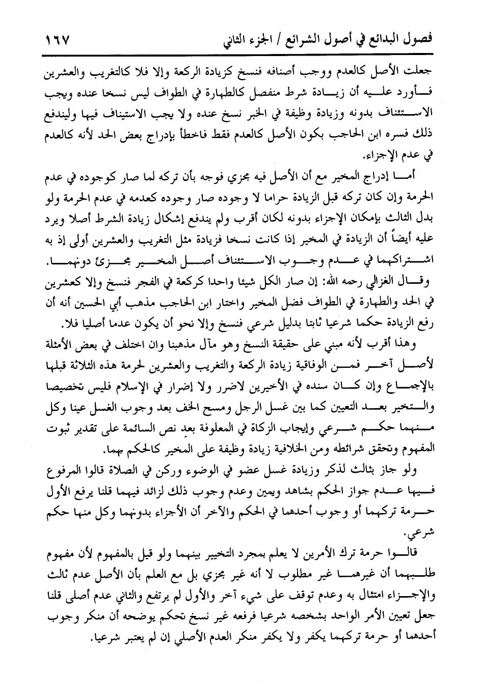 وقال الغزالي رحمه الله: إن صار الكل شيئا واحدا كركعة في الفجر فنسخ وإلا كعشرين في الحد والطهارة في الطواف فضل المخير واختار ابن الحاجب مذهب أبي الحسين أنه أن رفع الزيادة حكمًا شرعيا ثابتا بدليل شرعي فنسخ وإلا نحو أن يكون عدما أصليا فلا.