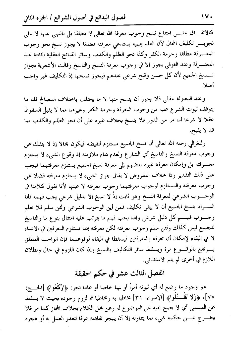 كالاتفاق على امتناع نسخ وجوب معرفة الله تعالى لا مطلقا بل بالنهي عنها لا على تجويز تكليف المحال لأن الحلم بنهيه يستدعي معرفته فعندنا لا يجوز نسخ نحو وجوب المعرفة مطلقا وحرمة الكفر وكذا نحو الظلم والكذب وسائر القبائح العقلية الثابتة عند المعتزلة وعند الغزالي يجوز إلا في وجوب معرفة النسخ والناسخ وقالت الأشعرية بجواز نسخ الجميع لأن كل حسن وقبح شرعي عندهم فيجوز نسخها إذ التكليف غير واجب أصلا.