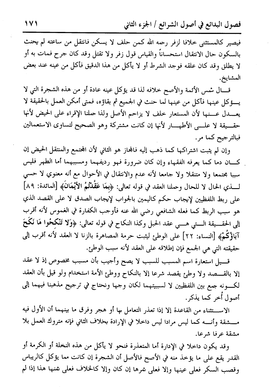 وإن لم يثبت اشتراكها كما ذهب إليه فالمجاز هو الثاني لأن المجتمع والمنتقل الحيض إن كان بما كما يعرفه الفقهاء وإن كان ضرورة فهو رديفهما ومسببهما أما الطهر فليس سببا مجتمعا ولا متنقلا ولا جامعا لأنه عدم والانتقال في الأحوال مع أنه معنوي لا حسي لذي الحال لا للحال وحملنا العقد في قوله تعالى: {بِمَا عَقَّدْتُمُ الْأَيْمَانَ} [المائدة: 89] على ربط اللفظيين لإيجاب حكم كاليمين بالجواب لإيجاب الصدق لا على القصد الذي هو سبب الربط كما فعله الشافعي رضي الله عنه فأوجب الكفارة في الغموس لأنه أقرب إلى الحقيقة التي هي عقد الحبل وهذا النكاح في قوله تعالى: {وَلَا تَنْكِحُوا مَا نَكَحَ آبَاؤُكُمْ} [النساء: 22] على الوطئ ليثبت حرمة المصاهرة بالزنا لا العقد لأنه أقرب إلى حقيقته التي هي الجمع فإن إطلاقه على العقد لأنه سبب الوطئ.