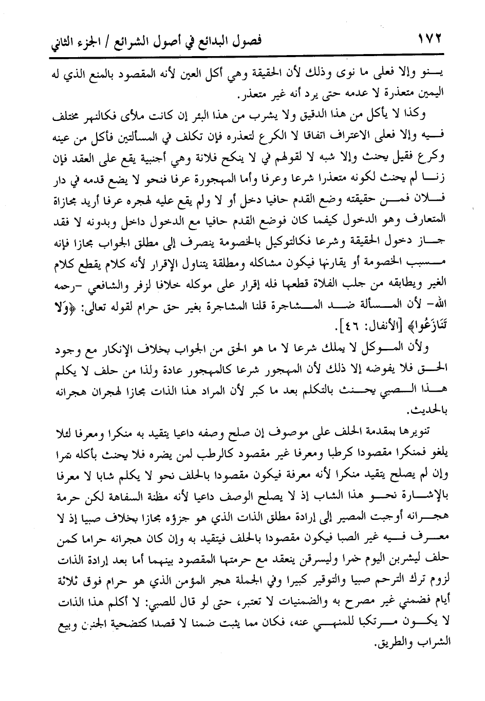 ولأن الموكل لا يملك شرعا لا ما هو الحق من الجواب بخلاف الإنكار مع وجود الحق فلا يفوضه إلا ذلك لأن المهجور شرعا كالمهجور عادة ولذا من حلف لا يكلم هذا الصبي يحنث بالتكلم بعد ما كبر لأن المراد هذا الذات مجازا لهجران هجرانه بالحديث.