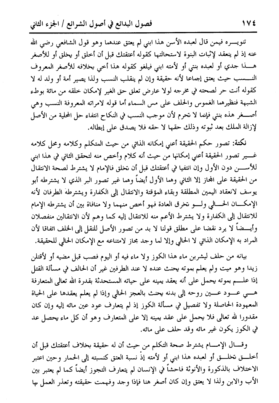 نكتة: تصور حكم الحقيقة أعني إمكانه الذاتي من حيث المتكلم وكلامه ومحل كلامه غير تصور الحقيقة أعني إمكانها من حيث أنه كلام وأخص منه لتحقق الثاني في هذا ابني للأسن دون الأول وإن انتفيا في أعتقتك قبل أن لخلق فالإمام لا يشترط لصحة الانتقال من الحقيقة على المجاز إلا الثاني وهما الأول أيضًا وهما غير تصور البر الذي لا يشترطه أبو يوسف لانعقاد اليمين المطلقة وبقاء المؤقتة والانتقال إلى الكفارة ويشترطه الطرفان لأنه الإمكان الحالي ولو تخرق العادة فهو أخص منهما ولا منافاة بين أن يشترطه الإمام للانتقال إلى الكفارة ولا يشترط الأعم منه للانتقال إليه كما وهم لأن الانتقالين منفصلان وأيضًا لا يرد نقضا على مطلق قولنا لا بد من تصور الأصل للنقل إلى اتخلف اتفاقا لأن المراد به الإمكان الذاتي لا الحالي وإلا لما وجد مجاز لامتناعه مع الإمكان الحالي للحقيقة.