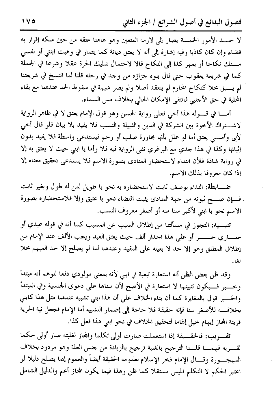أما في قوله هذا أخي فعلى رواية الحسن وهو قول الإمام يعتق لا في ظاهر الرواية لاشتراك الأخوة بين الشركة في الدين والقبيلة والنسب فلا يفيد بلا بيان فلو قال أخي لأبي وأمي يعتق أما لو علل بأنها مجاورة صلب أو رحم فيستدعي واسطة فلا يفيد بدون إلْباتها وكذا في هذا جدي مع البرغري نفى الرواية فيه فلا وأما يا ابني حيث لا يعتق به إلا في رواية شاذة فلأن النداء لاستحضار المنادى بصورة الاسم فلا يستدعى تحقيق معناه إلا إذا كان معروفا بذلك الاسم.