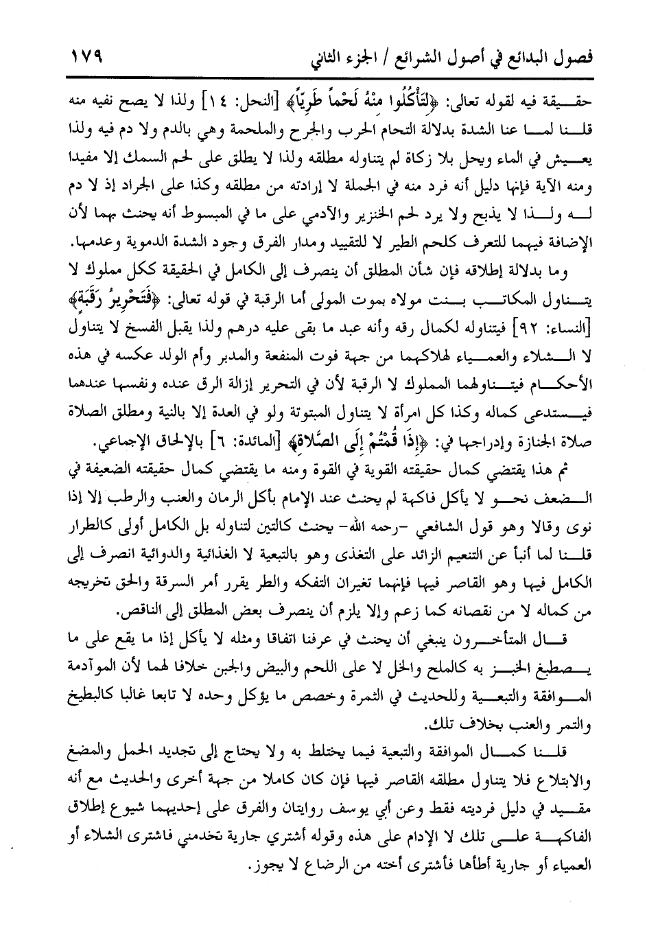 وما بدلالة إطلاقه فإن شأن المطلق أن ينصرف إلى الكامل في الحقيقة ككل مملوك لا يتناول المكاتب بنت مولاه بموت المولى أما الرقبة في قوله تعالى: {فَتَحْرِيرُ رَقَبَةٍ} [النساء: 92] فيتناوله لكمال رقه وأنه عبد ما بقى عليه درهم ولذا يقبل الفسخ لا يتناول لا الشلاء والعمياء لهلاكهما من جهة فوت المنفعة والمدبر وأم الولد عكسه في هذه الأحكام فيتناولهما المملوك لا الرقبة لأن في التحرير إزالة الرق عنده ونفسها عندهما فيستدعى كماله وكذا كل امرأة لا يتناول المبتوتة ولو في العدة إلا بالنية ومطلق الصلاة صلاة الجنازة وإدراجها في: {إِذَا قُمْتُمْ إِلَى الصَّلَاةِ} [المائدة: 6] بالإلحاق الإجماعي.
