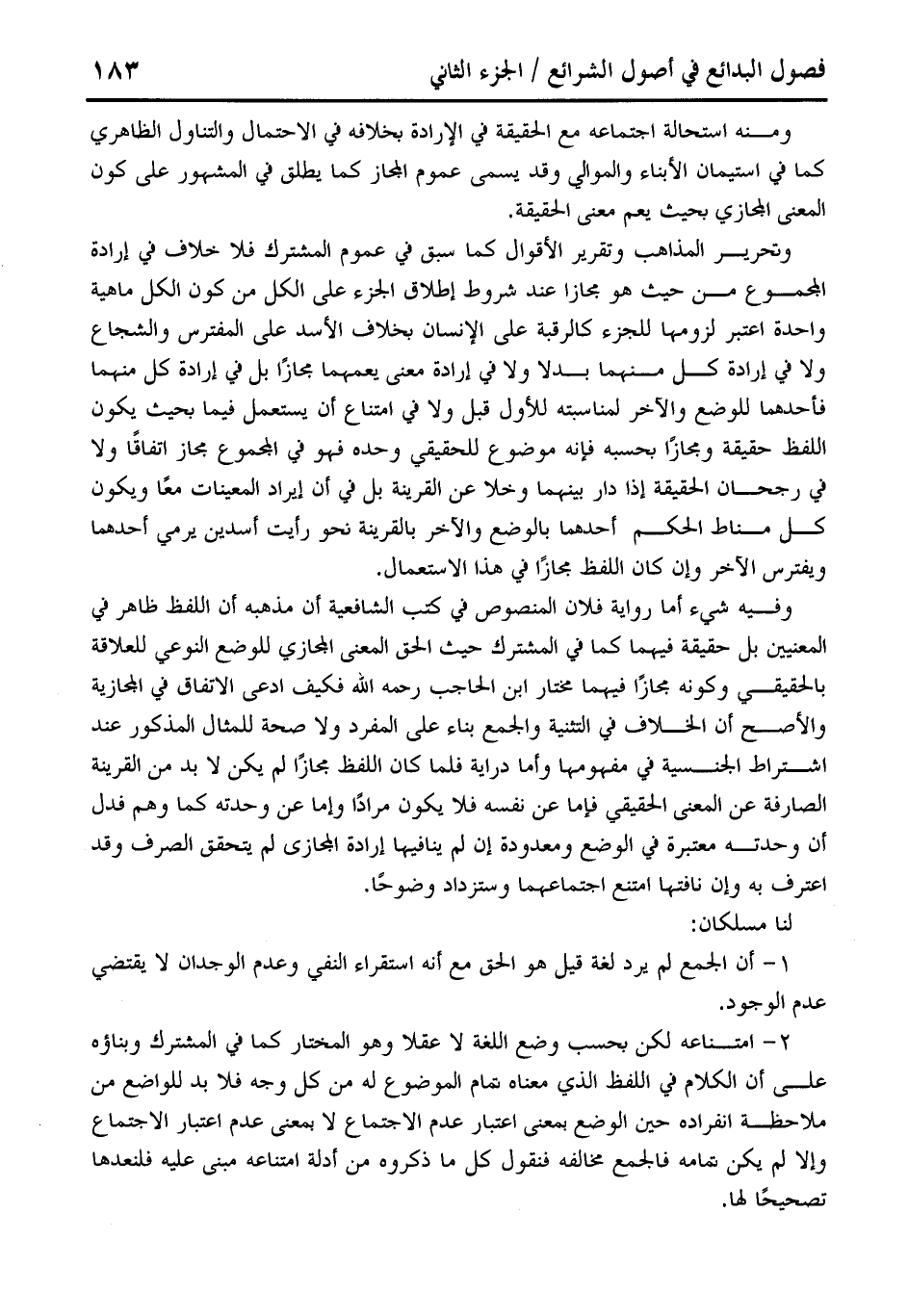 2 - امتناعه لكن بحسب وضع اللغة لا عقلا وهو المختار كما في المشترك وبناؤه على أن الكلام في اللفظ الذي معناه تمام الموضوع له من كل وجه فلا بد للواضع من ملاحظة انفراده حين الوضع بمعنى اعتبار عدم الاجتماع لا بمعنى عدم اعتبار الاجتماع وإلا لم يكن تمامه فالجمع مخالفه فنقول كل ما ذكروه من أدلة امتناعه مبنى عليه فلنعدها تصحيحًا لها.