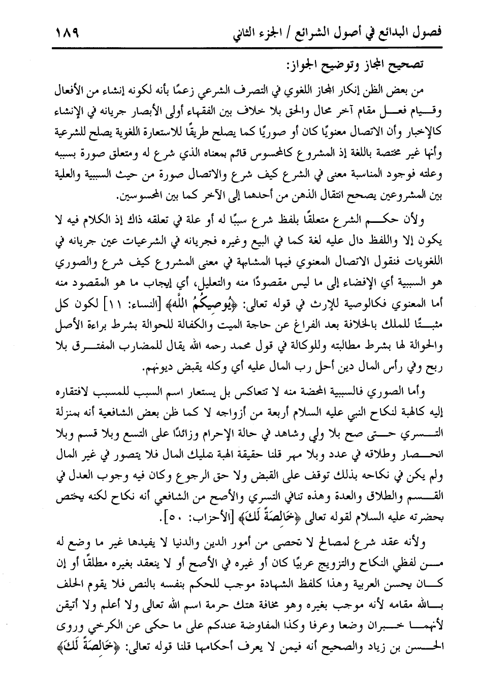 من بعض الظن إنكار المجاز اللغوي في التصرف الشرعي زعمًا بأنه لكونه إنشاء من الأفعال وقيام فعل مقام آخر محال والحق بلا خلاف بين الفقهاء أولى الأبصار جريانه في الإنشاء كالإخبار وأن الاتصال معنويًا كان أو صوريًا كما يصلح طريقًا للاستعارة اللغوية يصلح للشرعية وأنها غير مختصة باللغة إذ المشروع كالمحسوس قائم بمعناه الذي شرع له ومتعلق صورة بسببه وعلته فوجود المناسبة معنى في الشرع كيف شرع والاتصال صورة من حيث السببية والعلية بين المشروعين يصحح انتقال الذهن من أحدهما إلى الآخر كما بين المحسوسين.