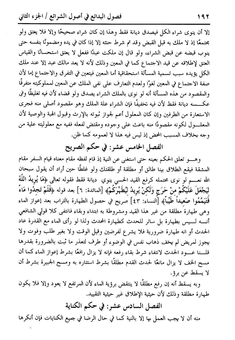 وهو تعلق الحكم بعينه حتى استغنى عن النية إذ قام لفظه مقام معناه قيام السفر مقام المشقة فيقع الطلاق بينا طالق أو مطلقة أو طلقتك ولو غلطًا حين أراد أن يقول سبحان الله نعم لو نوى محتمله كرفع القيد الحسن ينوي ديانة فقط فقوله تعالى {مَا يُرِيدُ اللَّهُ لِيَجْعَلَ عَلَيْكُمْ مِنْ حَرَجٍ وَلَكِنْ يُرِيدُ لِيُطَهِّرَكُمْ} [المائدة: 6] بعد قوله {فَلَمْ تَجِدُوا مَاءً فَتَيَمَّمُوا صَعِيدًا طَيِّبًا} [النساء: 43] صريح في حصول الطهارة بالتراب بعد إعواز الماء وهي طهارة مطلقة من غير هذا القيد ومشروطة به ابتداء وبقاء فانتفى كلا قولي الشافعي أنه ليس بطهارة بل ساتر للحديث كطهارة المحدث ولذا لو رأى الماء مع القدرة عاد الحدث أو أنه طهارة ضرورية فلا يشرع لفرضين وقيل الوقت ولا بغير طلب وفوت ولا يجوز لمريض لم يخف ذهاب نفس في الوضوء أو طرف لتعذر ما ثبت بالضرورة بقدرها قلنا عود الحدث لانتفاء شرط بقاء رفعه فإنه لا يزال رافعًا بشرط إعواز الماءكما أن مسح الخف لا يزال مانعًا لحدث القدم مطلقًا بشرط استتاره به ومسح الجبيرة بشرط أن لا يسقط عن برؤ.