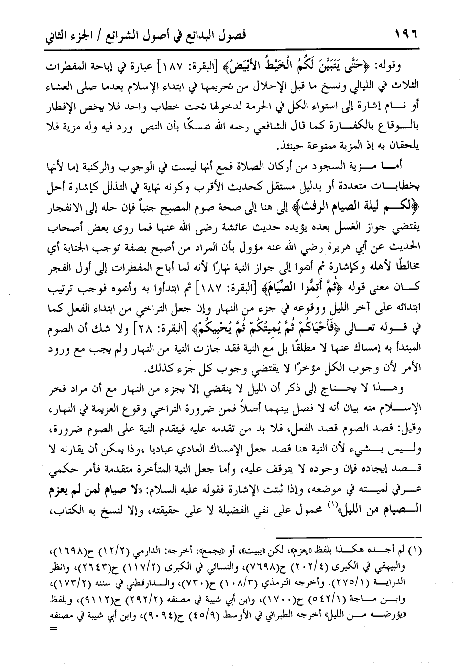 وهذا لا يحتاج إلى ذكر أن الليل لا ينقضي إلا بجزء من النهار مع أن مراد فخر الإِسلام منه بيان أنه لا فصل بينهما أصلًا فمن ضرورة التراخي وقوع العزيمة في النهار، وقيل: قصد الصوم قصد الفعل، فلا بد من تقدمه عليه فيتقدم النية على الصوم ضرورة، وليس بشيء لأن النية هنا قصد جعل الإمساك العادي عباديا، وذا يمكن أن يقارنه لا قصد إيجاده فإن وجوده لا يتوقف عليه، وأما جعل النية المتأخرة متقدمة فأمر حكمي عرفي لميته في موضعه، وإذا ثبتت الإشارة فقوله عليه السلام: "لا صيام لمن لم يعزم الصيام من الليل" (¬1) محمول على نفي الفضيلة لا على حقيقته، وإلا لنسخ به الكتاب،