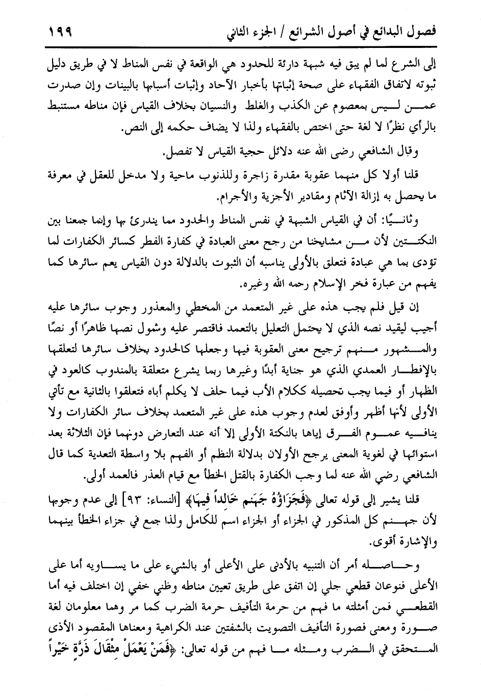 وثانيًا: أن في القياس الشبهة في نفس المناط والحدود مما يندرئ بها وإنما جمعنا بين النكتتين لأن من مشايخنا من رجح معنى العبادة في كفارة الفطر كسائر الكفارات لما تؤدى بما هي عبادة فتعلق بالأولى يناسبه أن الثبوت بالدلالة دون القياس يعم سائرها كما يفهم من عبارة فخر الإِسلام رحمه الله وغيره.