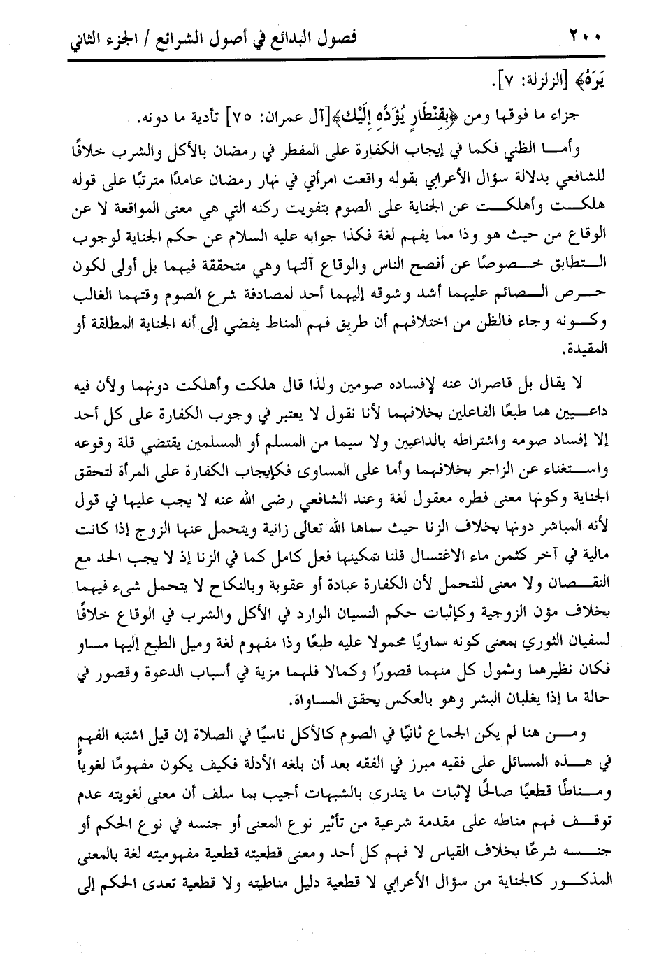 وأما الظني فكما في إيجاب الكفارة على المفطر في رمضان بالأكل والشرب خلافًا للشافعي بدلالة سؤال الأعرابي بقوله واقعت امرأتي في نهار رمضان عامدًا مترتبًا على قوله هلكت وأهلكت عن الجناية على الصوم بتفويت ركنه التي هي معنى المواقعة لا عن الوقاع من حيث هو وذا مما يفهم لغة فكذا جوابه عليه السلام عن حكم الجناية لوجوب التطابق خصوصًا عن أفصح الناس والوقاع آلتها وهي متحققة فيهما بل أولى لكون حرص الصائم عليهما أشد وشوقه إليهما أحد لمصادفة شرع الصوم وقتهما الغالب وكونه وجاء فالظن من اختلافهم أن طريق فهم المناط يفضى إلى أنه الجناية المطلقة أو المقيدة.