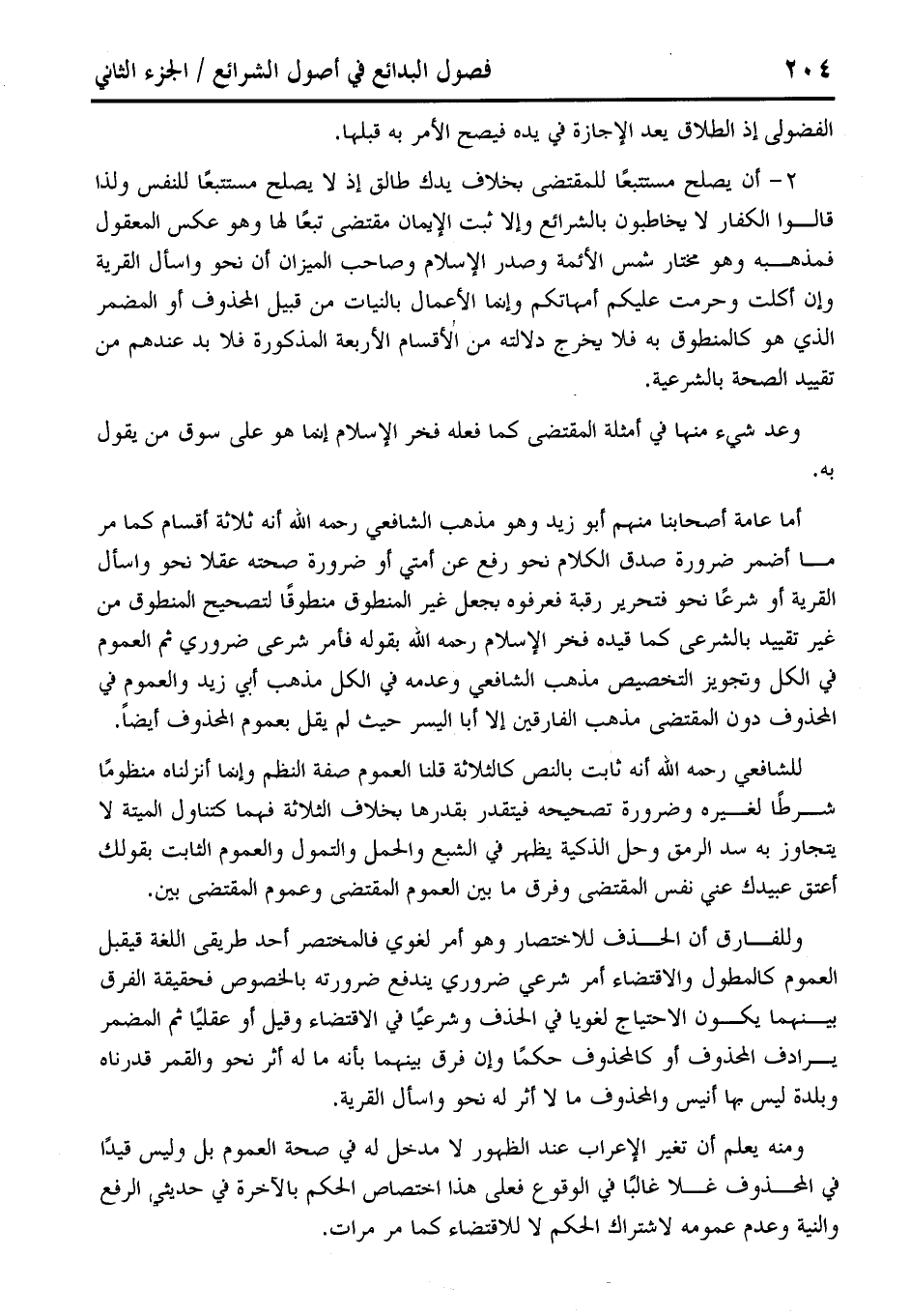 2 - أن يصلح مستتبعًا للمقتضى بخلاف يدك طالق إذ لا يصلح مستتبعًا للنفس ولذا قالوا الكفار لا يخاطبون بالشرائع وإلا ثبت الإيمان مقتضى تبعًا لها وهو عكس المعقول فمذهبه وهو مختار شمس الأئمة وصدر الإِسلام وصاحب الميزان أن نحو واسأل القرية وإن أكلت وحرمت عليكم أمهاتكم وإنما الأعمال بالنيات من قبيل المحذوف أو المضمر الذي هو كالمنطوق به فلا يخرج دلالته من الأقسام الأربعة المذكورة فلا بد عندهم من تقييد الصحة بالشرعية.