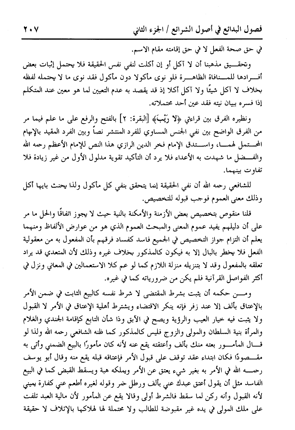 قلنا منقوص بتخصيص بعض الأزمنة والأمكنة بالنية حيث لا يجوز اتفاقًا والحل ما مر على أن دليلهم يفيد عموم المعنى والمبحث العموم الذي هو من عوارض الألفاظ ومنهما يعلم أن التزام جواز التخصيص في الجميع فاسد كفساد فرقهم بأن المفعول به من معقولية الفعل فلا يخطر بالبال إلا به فيكون كالمذكور بخلاف غيره وذلك لأن المتعدي قد يراد تعلقه بالمفعول وقد لا بتنزيله منزلة اللازم كما لو عم كلا الاستعمالين في المعاني ونزل في أكثر الفواصل القرآنية فلم يكن من ضرورياته كما في غيره.
